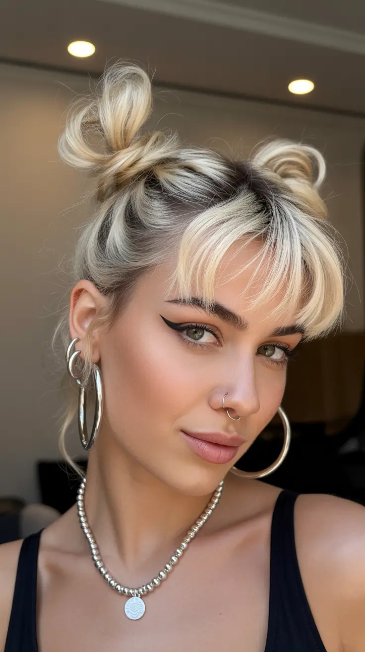 There’s something about short hair in double space buns paired with cute baby bangs that feels like a high-five from holographic glitter. It’s bold, adventurous, and—let’s be real—loudly declares that you came to “own” the look, not just wear it. The bangs bring a modern twist, and the buns are basically tiny street signs saying, “Confidence, this way.” If you want to channel Y2K memories but with the high-def upgrade of 2025, this is your hairstyle.