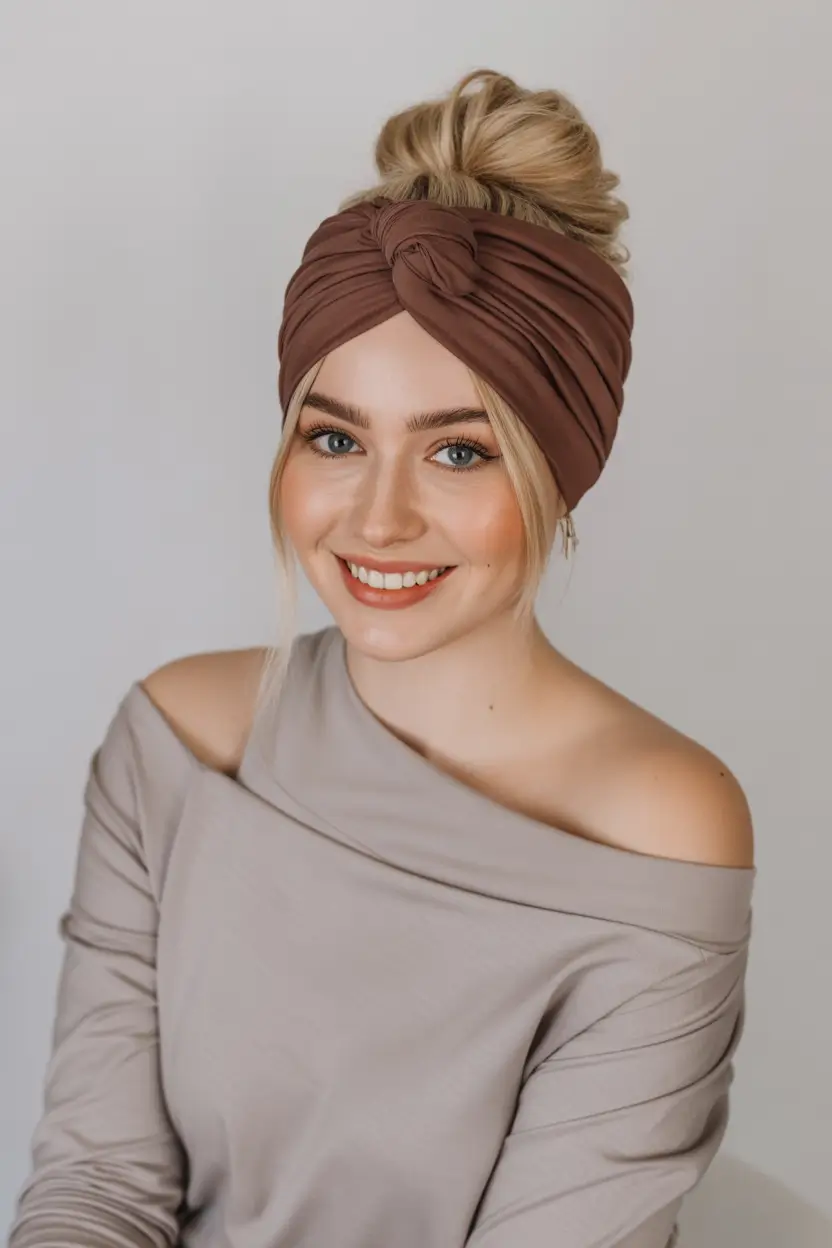 A messy top knot crowned with a soft, turban-style band makes short hair dance with energy. This quick fix gives you polished hair without marathoning the mirror. Elevating the knot widens the face and the wrap adds a playful twist.