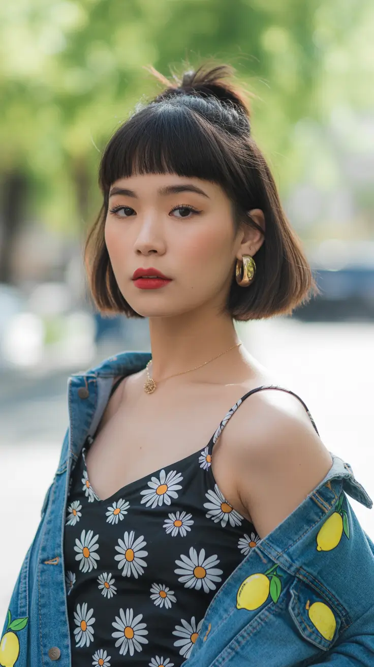 Picture a shiny straight bob that hugs your jawline, crowned with a sassy mini fringe. The combo carves definition on soft round cheeks and adds a refined edge. The fringe is effortlessly cool, yet the sharp bob keeps it polished. I love how the angular ends frame the face, redirecting the eye and giving you that oh-so-desired oval illusion. Slip on a tailored coat and ankle boots, and you’re instantly a little Parisian, a little downtown rock star, and 100% you.