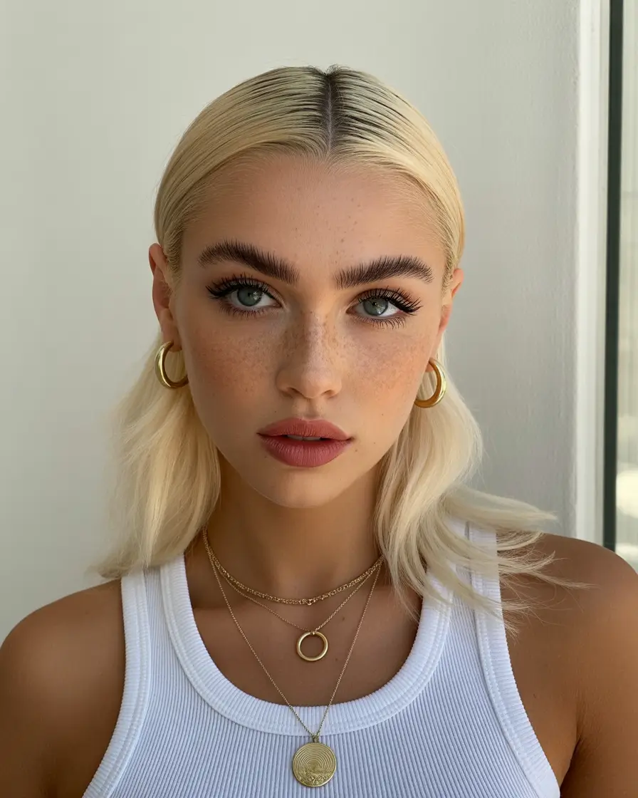 If you love letting your hair flow but still crave definition, this sleek, medium-length blonde style with a center part checks every box. Placing the part down the middle does wonders for round faces by giving the illusion of length, perfectly balancing the proportions. The vibe is polished, fresh, and right on schedule for the 2025 minimalist look.