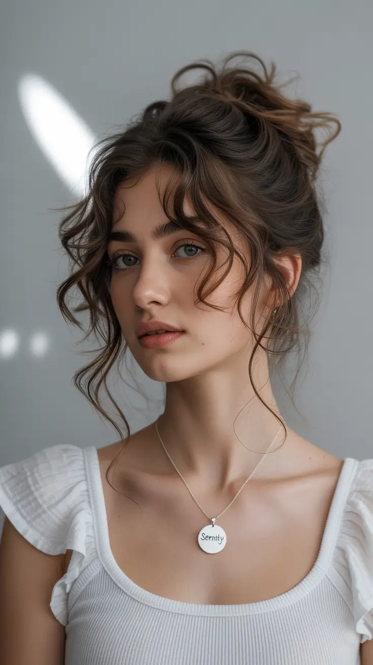 Whenever I daydream about romance on a cool autumn night, this messy updo pops into my head. It features loose waves that frame the face as if the wind gently styled them, lending a soft, feminine vibe. If your face is round, the tousled height on top plus a side bang lift the silhouette and add flattering angles.