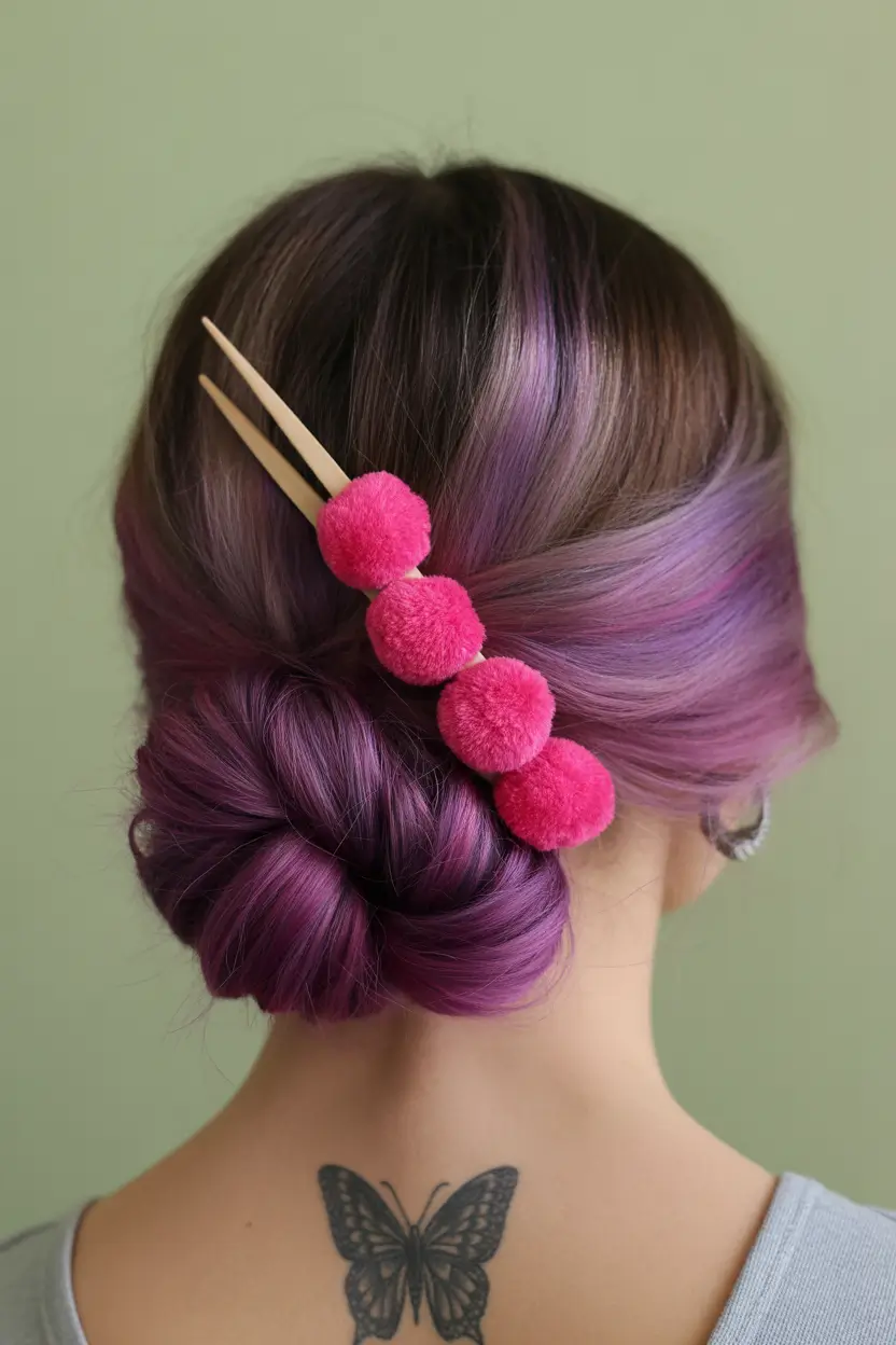 Why stop at basic shades? This sculpted bun, painted in glossy deep purple, offers both vertical lift and a gorgeous splash of personality. Pom pom beads add an extra dose of whimsy, reminding us that hair can double as wearable art. The height balances a round face, elongating the look, while the bold violet brings serious edge. Sculpturous styles like this show that daring creativity can absolutely coexist with round faces, making this fall look one of my top 2025 hairns.