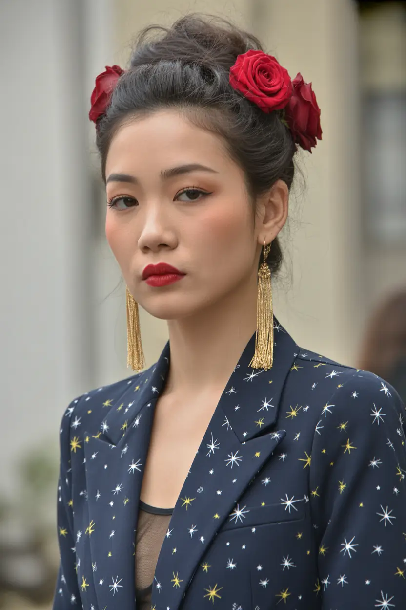 A polished updo topped with vivid flowers is hard to beat. The silky crown lifts the hair away from the sides, stretching a round face upward and creating a sleek, sophisticated line. Those rich crimson roses? They crank up the intensity, perfect for a classy graduation photo or a night out with sparkle. The look is an equal mix of soft romantic charm and fierce confidence—delicate yet utterly commanding.