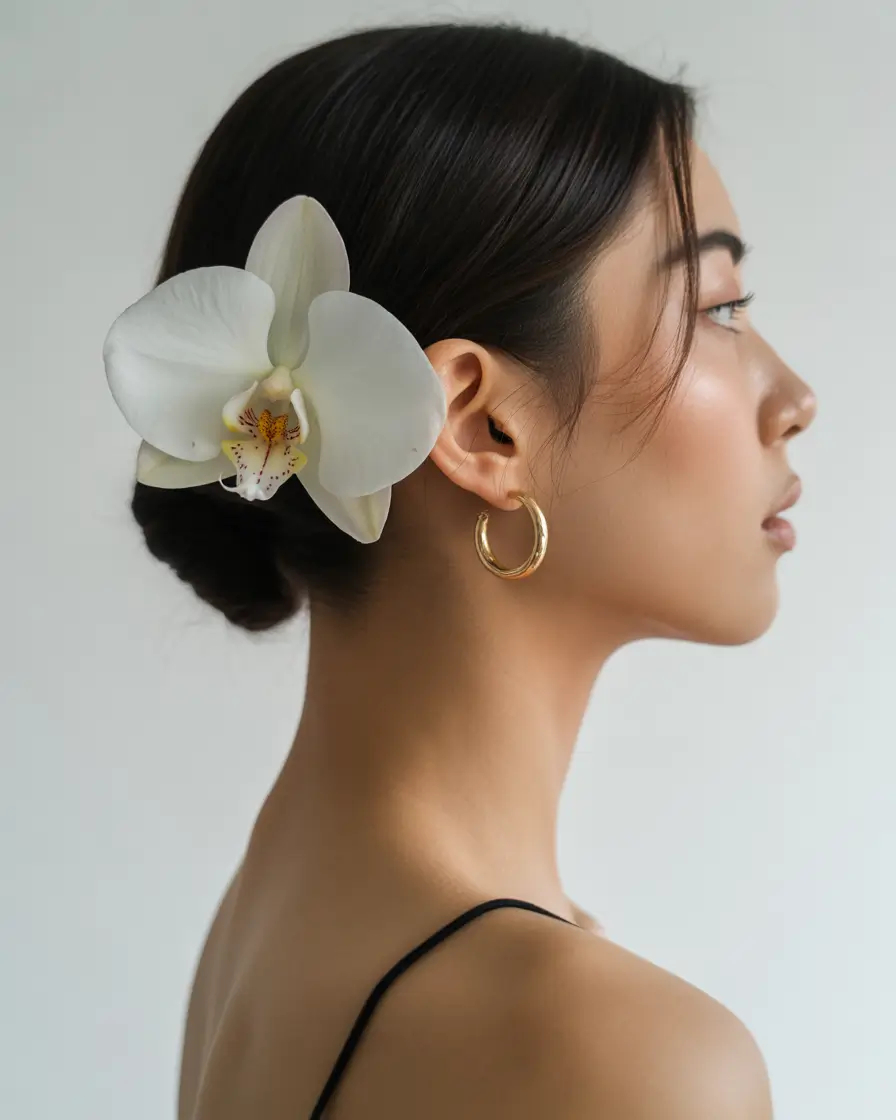 A polished bun is my go-to for effortless glam. It lifts everything without fuss, and on a round face, it visually chews up inches. Orchid—just one—pinned behind the ear shifts that tidy up a notch to “lady in lavender silk” without making a fuss. Fall evenings love this subdued luxe, letting the little this be the highlight.
