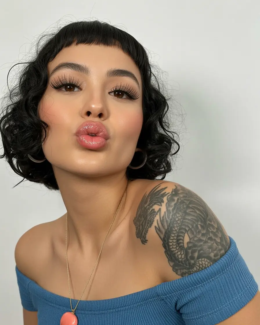 Curls are completely stealing the spotlight this season. Picture this medium-length curly bob, all springy texture, plus choppy bangs that barely arch. The shape hugs a round face perfectly, bringing irresistible, goofy charm, while the little fringe is the cue that says, “I may have a fun side, and it’s 2025.”