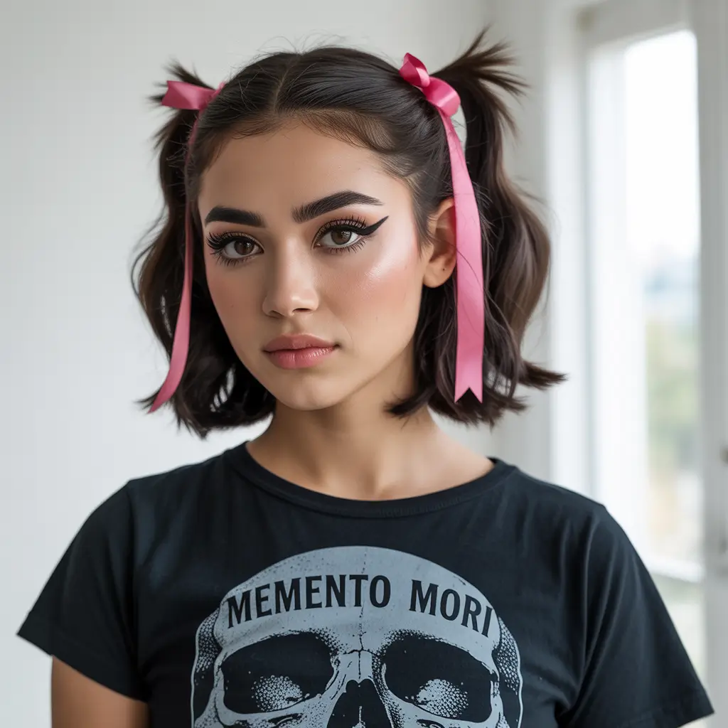 Short, softly tousled hair decorated with pink-ribbon-tied double buns is pure girl-next-door fun. Buns positioned high on a round face create flattering vertical lift, while a few face-framing strands keep everything sweet and approachable. This is one of the cute Fall hairstyles for round faces 2025 and walks the tightrope between whimsical and edgy—don’t be afraid to layer on some dark liner and wear a trusty graphic tee for extra punch.