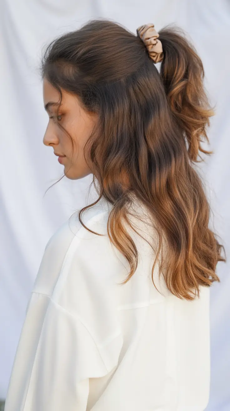 A half-up ponytail with gentle beachy waves is like a soft-focus filter for fall hair. It lifts the crown and lets the rest of your hair frame a round face beautifully—a flattering trick you’ll love. I reach for this hairstyle all the time in 2025: the look is chic enough for brunch, yet casual enough for a stroll, and can even hold its own at a semi-formal gathering.