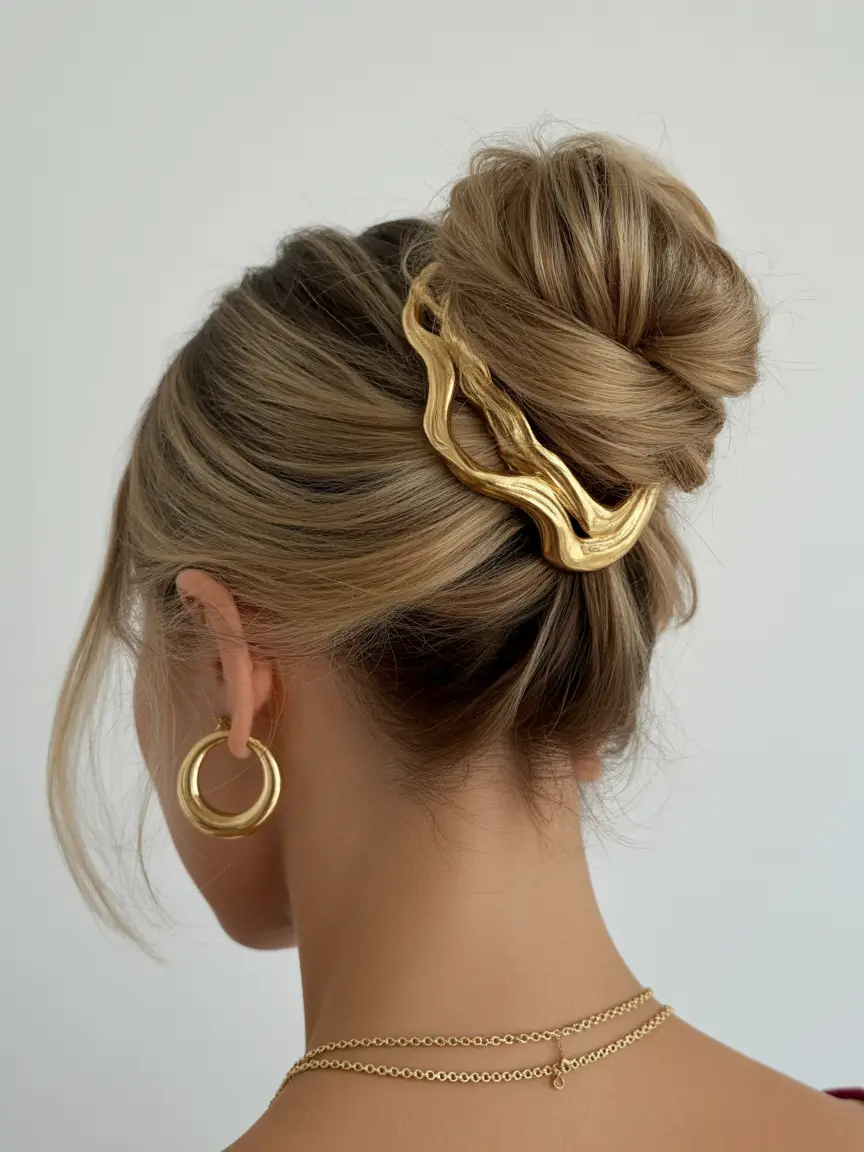 This style is pure art in action. Celebrity stylist Jen Atkin is spot-on: the right accessory can elevate the simplest bun to red-carpet status. The gold clip here is the star. It’s quick to create, making it the ultimate go-to for a night out. With a hairstyle this stunning, no sparkly earrings or heavy makeup are needed—just a swipe of lip color and you’re ready to shine.