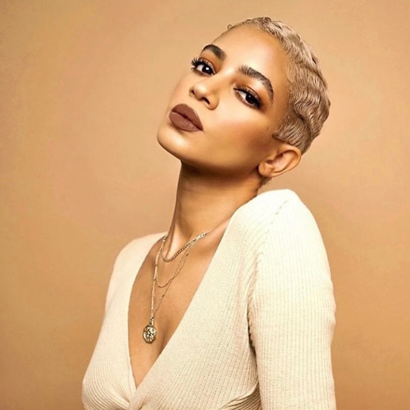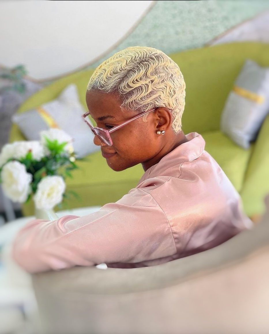 This blonde pixie cut features precise finger waves that hug the scalp, creating a vintage-inspired look. The short length highlights the intricate waves, making it perfect for those with short natural hair. The blonde tone adds a polished and modern touch to this 1920s-style haircut.