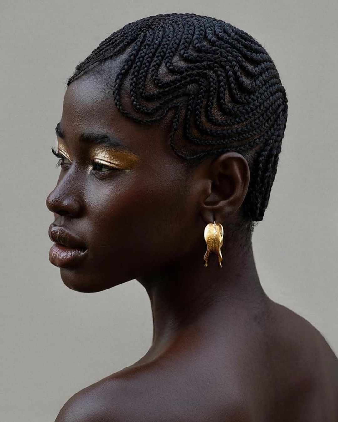 This hairstyle combines intricate braiding with the structured design of finger waves for a bold and creative look. The tightly woven braids mimic the flowing patterns of waves, perfectly styled for 4C hair. This unique design highlights natural hair versatility with a modern twist.