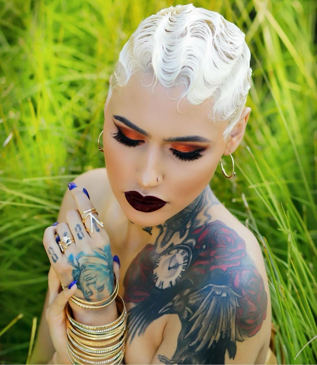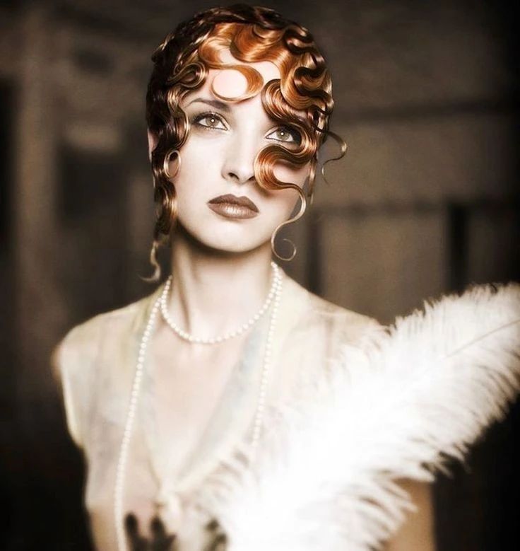 This short hairstyle features crisp, icy white finger waves sculpted with dramatic definition. The striking color adds a futuristic touch to the classic 1920s wave design. Ideal for those wanting to experiment with bold, short hair trends, this look is both daring and stylish.