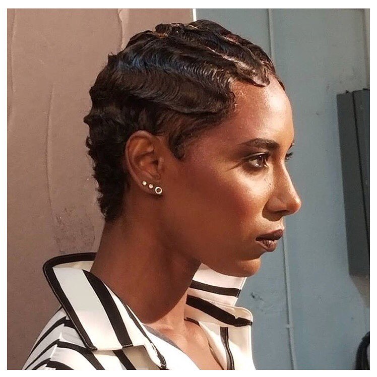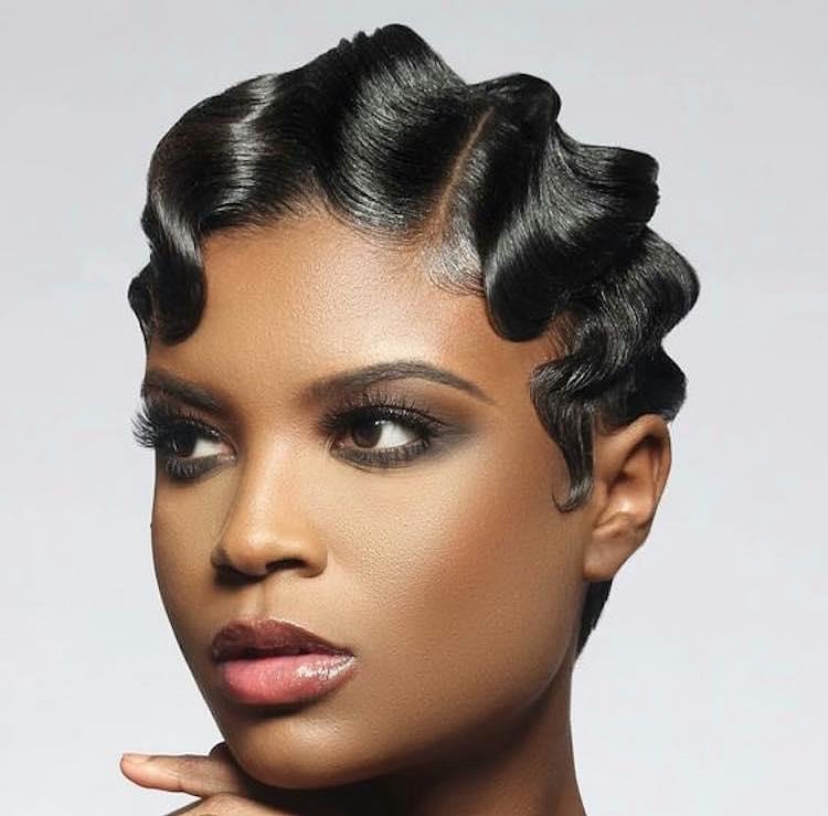 These glossy, side-parted finger waves frame the face with a smooth and elegant finish. The precise wave pattern creates a polished and timeless look, ideal for short natural hair. Perfect for formal occasions, this style exudes vintage sophistication with a modern edge.