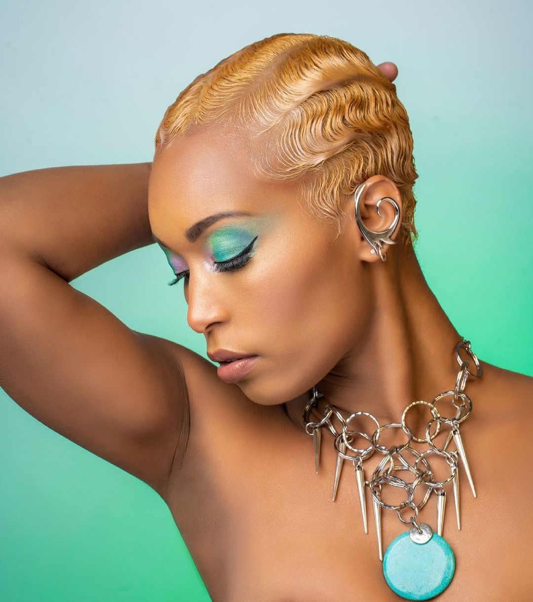 This hairstyle features sleek golden blonde finger waves styled close to the scalp, enhancing the head’s natural shape. The glossy texture emphasizes the wave pattern, creating a bold yet elegant look. Perfect for those embracing short hair with a vibrant color twist.