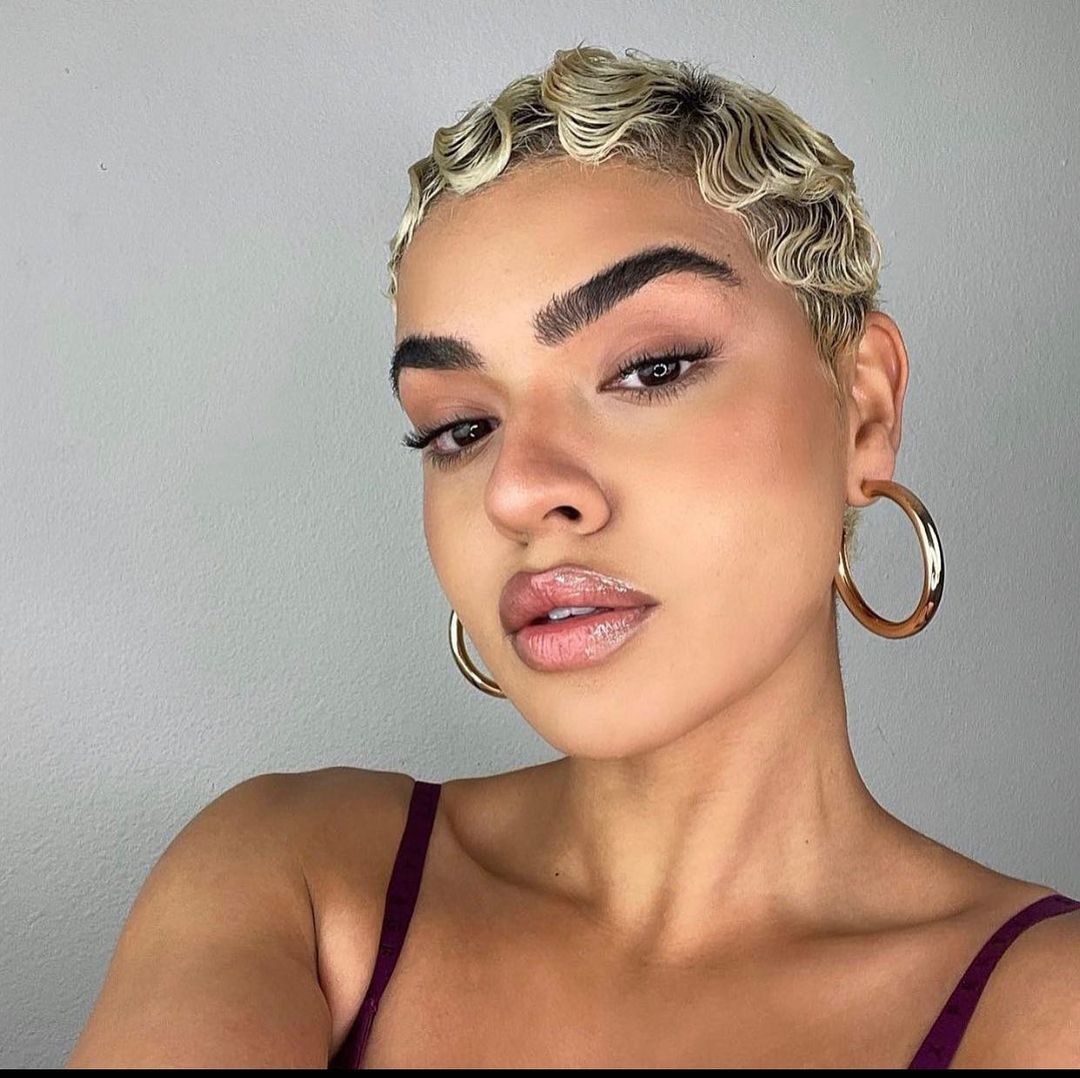 This hairstyle combines golden blonde finger waves with a textured, playful finish. The short length enhances the sculpted details of the waves, creating a vibrant and dynamic appearance. Perfect for those seeking a bold yet elegant style.