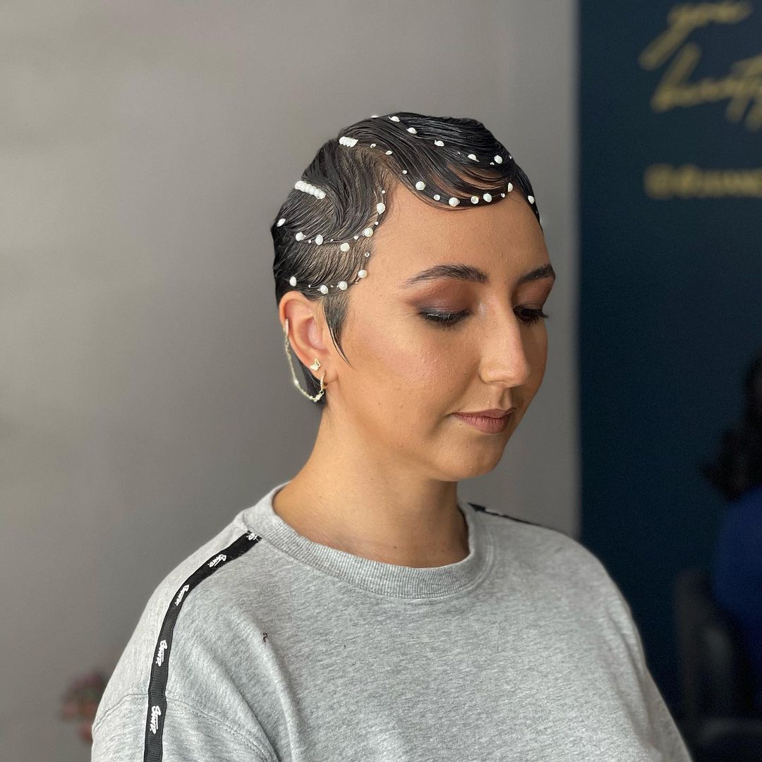 This hairstyle features sleek black finger waves adorned with pearl accents for a luxurious and elegant touch. The waves are meticulously styled to follow a smooth, symmetrical flow across the scalp. Perfect for short hair, this look combines vintage sophistication with modern embellishments.