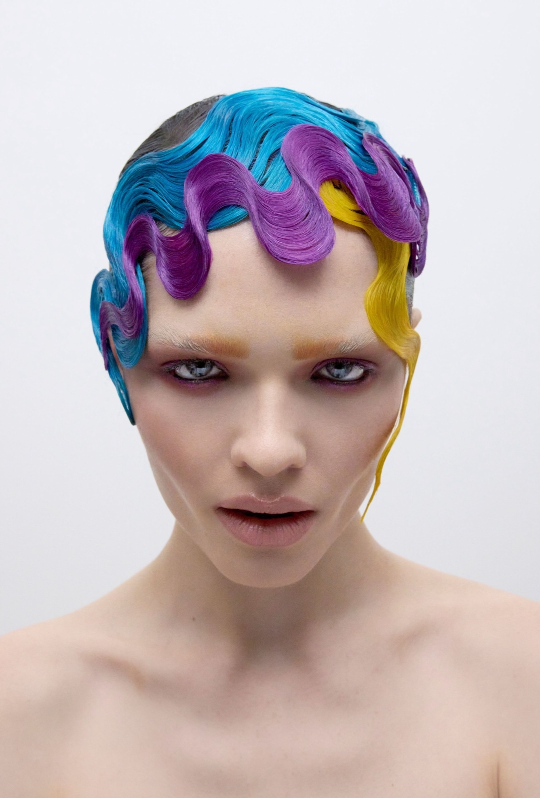 This hairstyle stands out with bold finger waves in blue, purple, and yellow hues for a vibrant, artistic effect. The exaggerated waves create a dynamic look, perfect for those wanting a dramatic style. Ideal for wigs or long hair, it’s a creative take on finger waves haircuts for 2025.