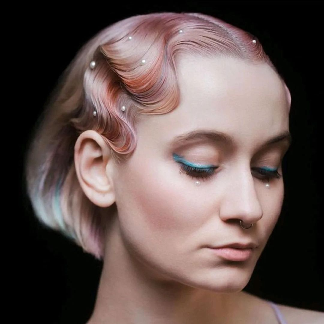 This hairstyle combines delicate pink tones with soft finger waves that flow seamlessly across the head. Tiny pearl accents highlight the waves, adding a romantic and whimsical touch. Ideal for medium hair, this style blends a vintage look with modern elegance.
