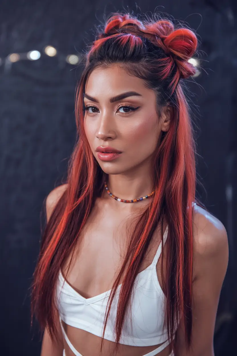 The vibrant appearance includes red streaks which smoothly shift to dark brown tones to produce a vivid contrasting illumination. Both straight and double top knot elements work together harmoniously to provide sleek appearance with a youthful and playful finish. People who need a noticeable summer style must choose this hairstyle since it suits those under 18 years old and young females. This playful version of highlights combines classic tones with black blond and red elements to create an exciting style effect.