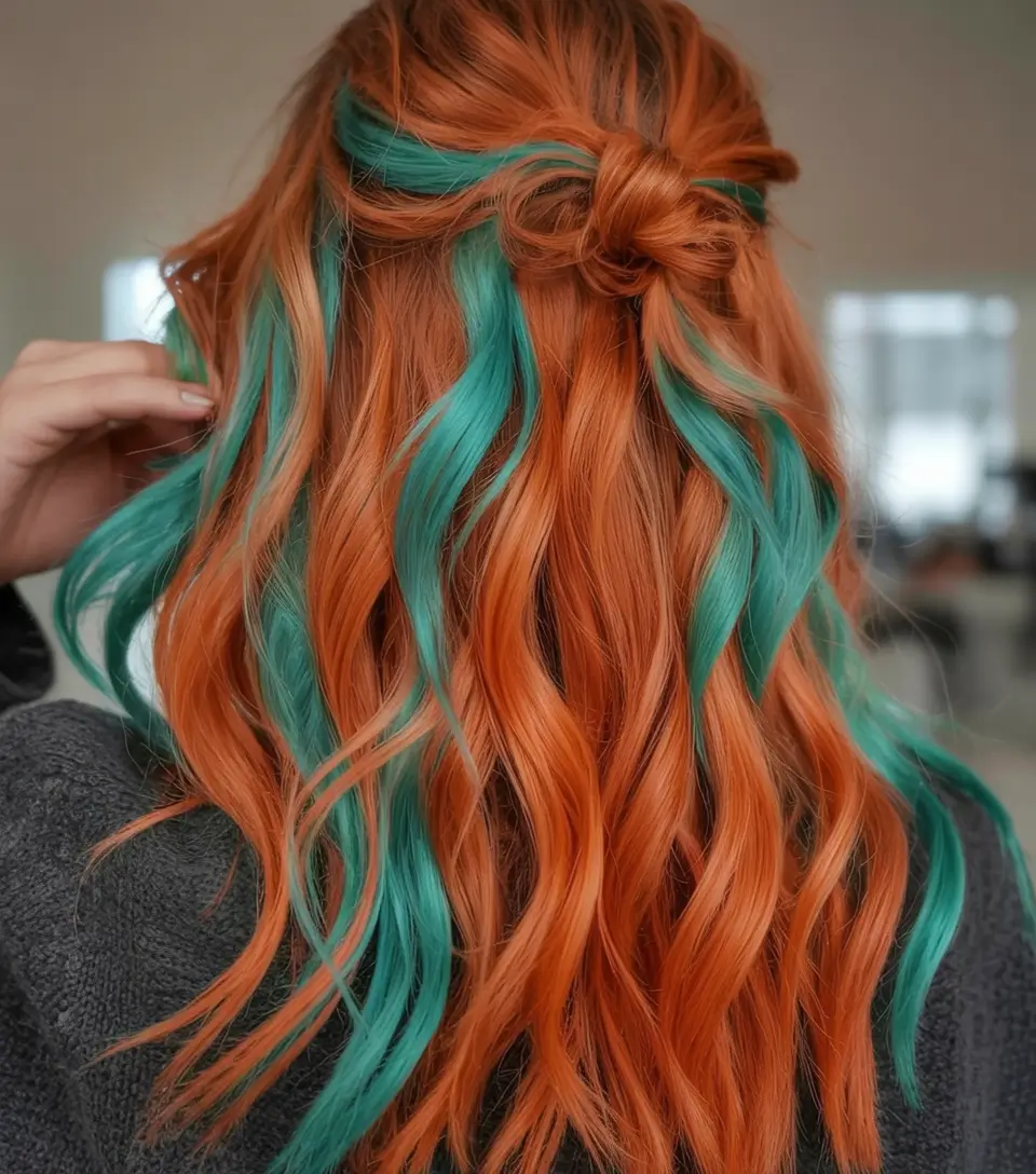 The tropical appearance emerges from the bold combination of bright orange waves with electrifying blue-green streaks which create stunning visual contrast. A casual appearance comes from the half-up knot while the color stands out from all sides through its blend of multiple shades. Teenagers together with brave women may use this option to create eye-catching highlights which make their appearance stand out. The latest gorgeous hair highlights collection of 2025 features this highlight design as its showstopping standout idea.