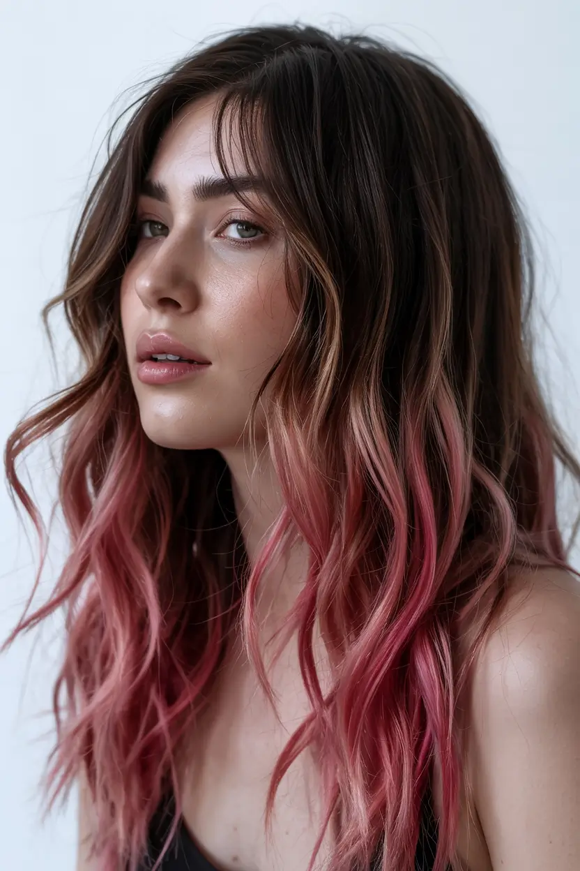The dark brown waves turn naturally into gentle rose pink tips which create an enchanting, playful appearance. The lightweight design of this style works best for brown and black hair types that require contemporary coloring. This fashion suits young women just as well as it matches women following modern trends. This style brings this year’s most desired color styles in a refreshing update.