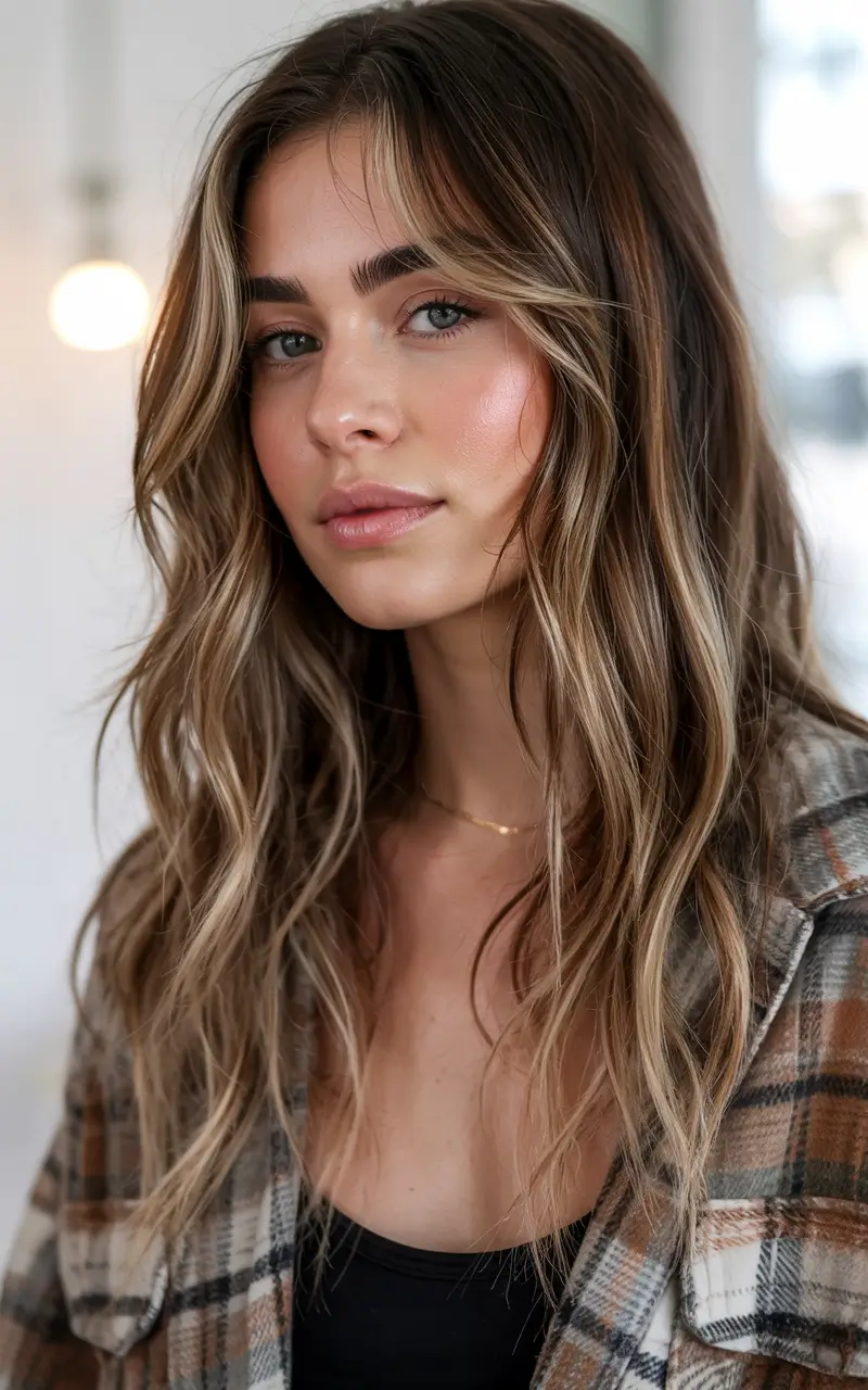 The hairstyle combines deep brown hair with complementary soft caramel highlights to create warm and natural richness. Her long layered hairstyle features casual wavy movements which generate size without blurring the design. This hairstyle provides muted lightness and elegance while taking care of sophisticated style requirements. A simple yet elegant hair highlight technique functions as a suitable everyday style for summer 2025.