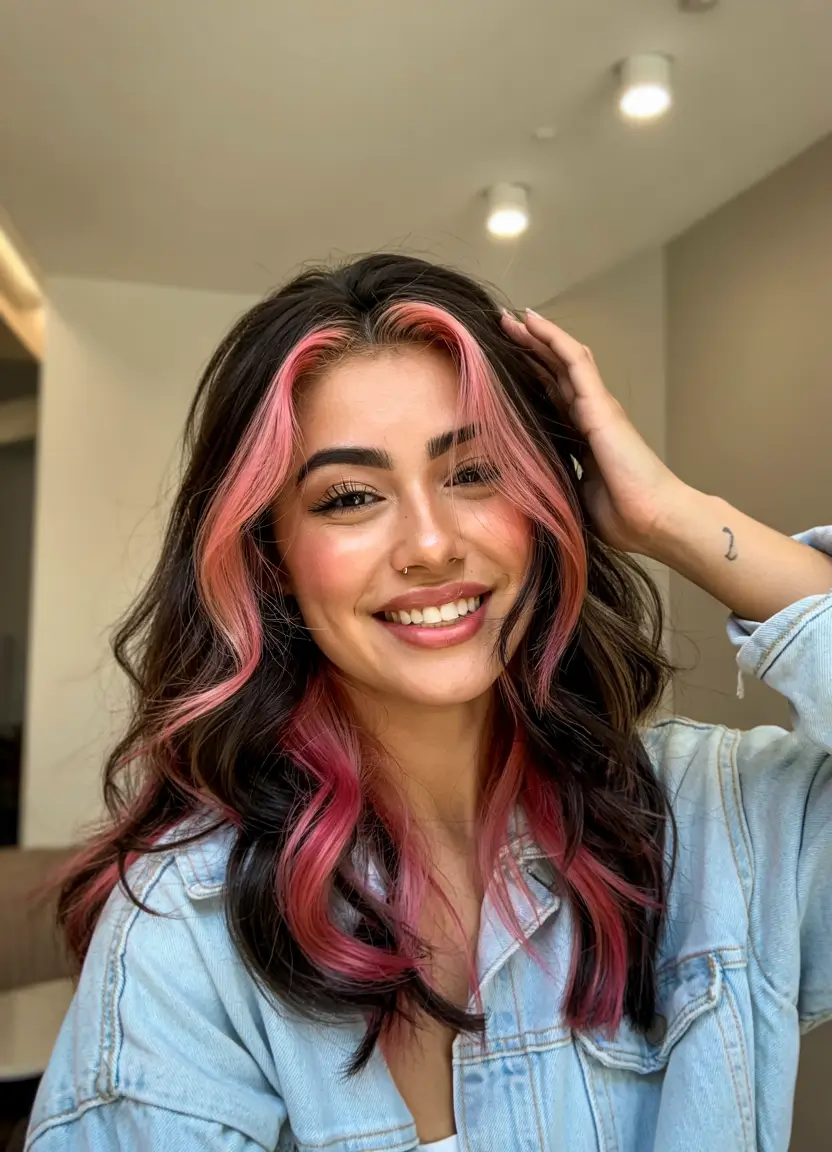 A bold pink color frames the face while standing out from this black and dark brown foundation. Large flowing curls create a young and energetic look when contrasted with each other. Teenagers together with people with brown and Indian skin tones as well as color-lovers who want temporary highlights without involving their entire head will find this perfect. A modern take on highlights with playful placement and maximum impact.