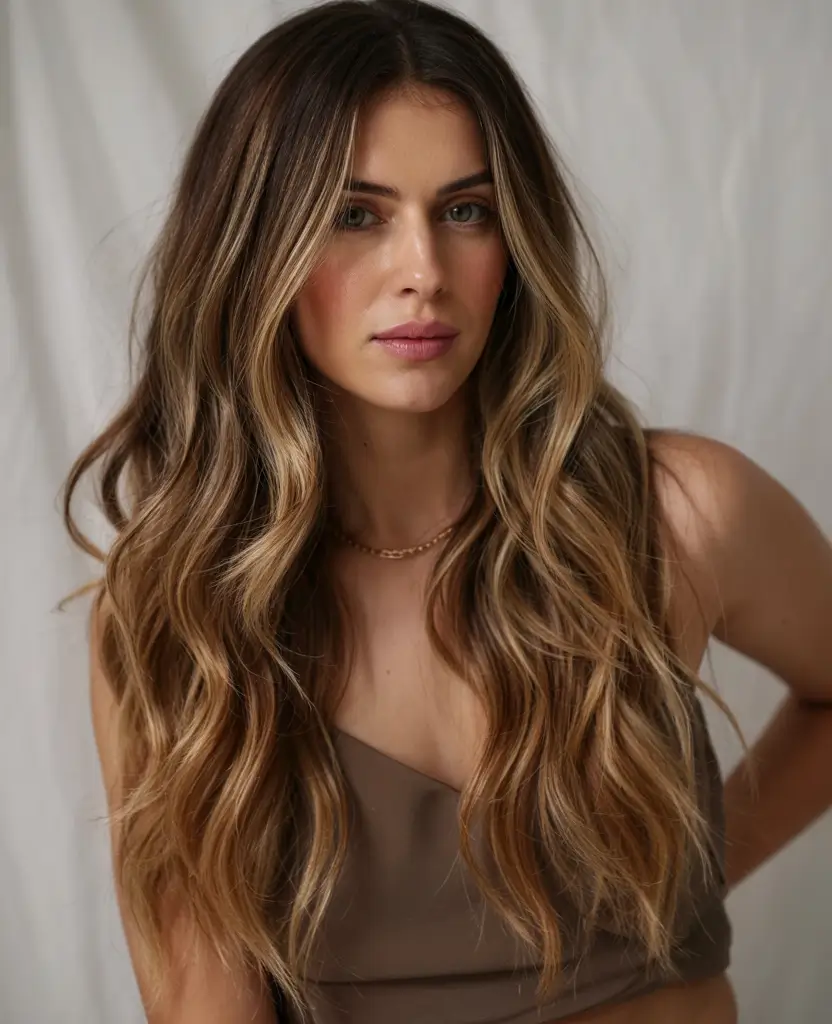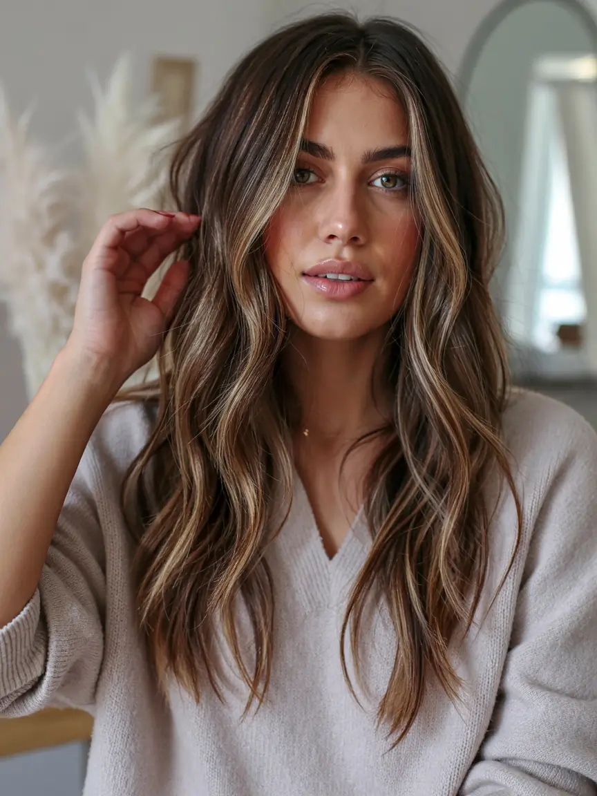 The hair creation combines delicate dirty blonde balayage with deep brown hair at its core. During summer this natural wave pattern with extended layers delivers an easygoing summertime appearance. The hair style is suited for people who want touch-up brightness without changing their natural hair tones. This classic color combination retains its position as one of the trendy hair highlight styles for future summers starting 2025.