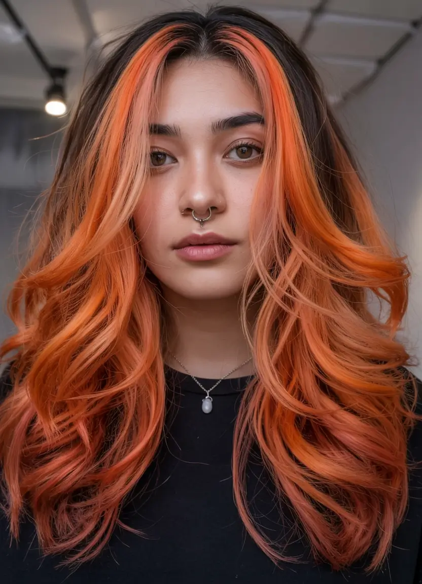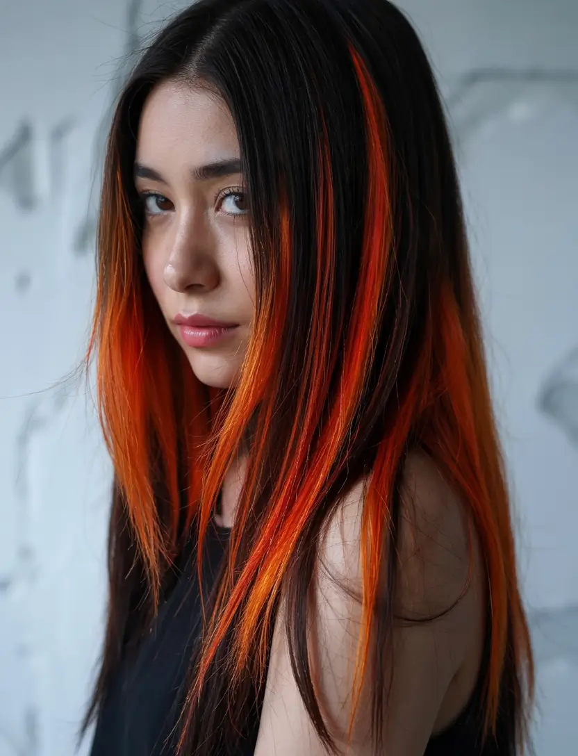 This attention-grabbing hair color creates intense orange highlights that specifically enhance the facial area underneath layers of dark black hair. The many volumes of wavy locks provide energetic motion to show off the lively facial highlights. The style suits teenagers together with brown skin beauty types who wish to become the summer spotlight. This bright and colorful highlight design belongs to the adventurous side of summer 2025 coloring trends.