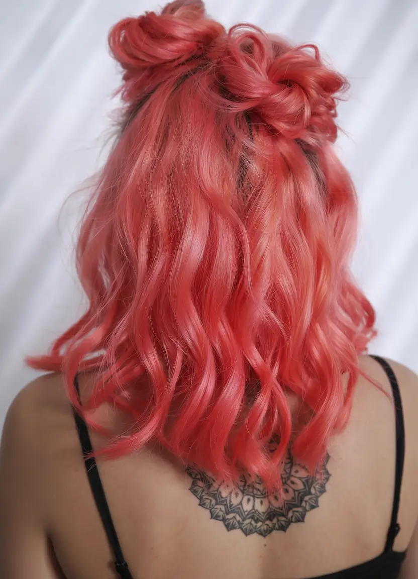 The style incorporates trendy double buns made from vivid coral pink waves that sit at the crown. Its short design together with its loose structure creates a delicate and breezy effect suitable for hot summer climate. Memoir sunrays address the needs of brown-skinned individuals who seek beautiful summer hues. This vibrant red color stands as an excellent option for teenagers alongside other individuals wanting radiant substance in their hair.