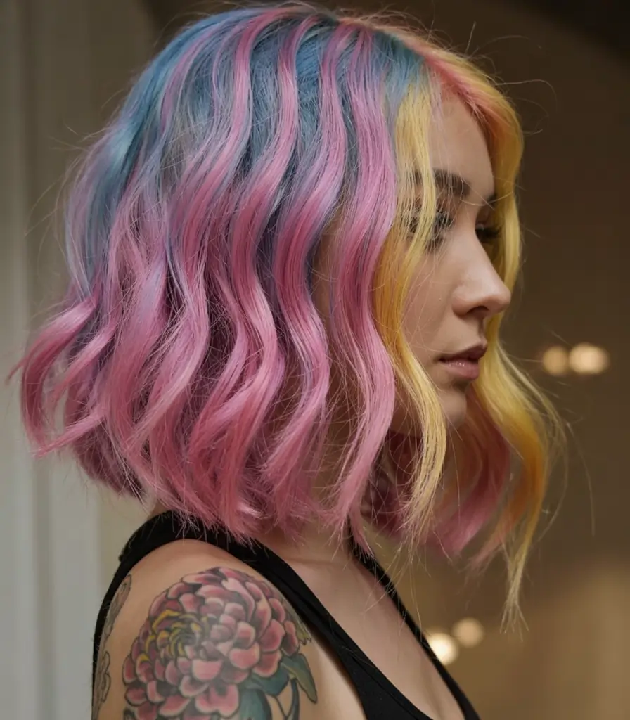 The bold short bob features divisions of blue purple pink and yellow colors to create a complete fantasy hair appearance. The combination of vibrant single colors works together peacefully because gentle waves coordinate between them. Women and teenage individuals who love unique expressions through colors will find this courageous hairstyle perfect. Color trends encounter genuine artistic style in this summer’s top lineup through this exciting hair creation.