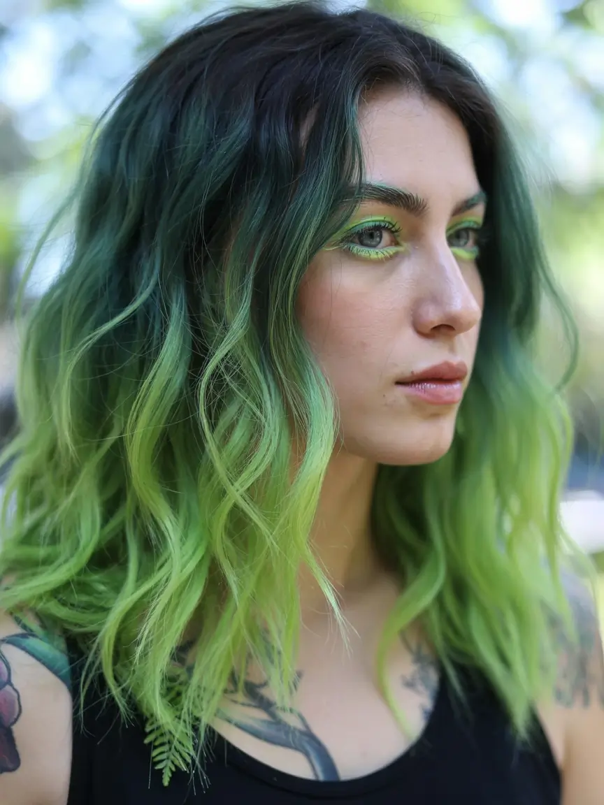The color transformation from intense black to lustrous emerald and lime green produces a powerful ombre appearance reminiscent of a forest. The ocean-inspired waves show gentle ruffles and intricate curves which lead the color transition across the hair. Women who prefer fantasy-colored styles along with teenage individuals looking for edgy colorful patterns will find this look ideal. A bold choice from the more adventurous side of this season’s color trends.