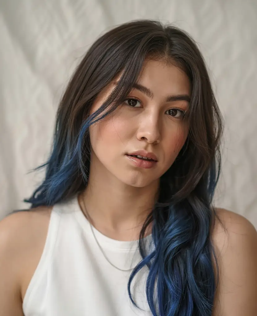 Deep dark brown waves display blue dip-dyed ends that create an enchanting oceanlike cool appearance. The start of the color appears faint at first yet grows bright enough to suit both protective and bold hairstyles. For Indian and dark-skinned and brown-based people this particular hairstyle provides an extraordinary opportunity to experiment with cool-toned shades. A sleek and modern nod to black blond and red alternatives with a colorful twist.