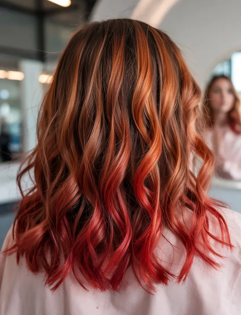 The appearance features orange and red streaks framing the face on cascade-shaped brown layers that create a visual effect of fire movement. The extended waves deliver theatrical effect and fluidity to the hairstyle but the intense hues add excitement across the complete appearance. This style provides an artistic opportunity for people with brown skin and dark hair to experiment with attractive bold colors. A fiery entry appears in the list of gorgeous hair highlights ideas to try during summer 2025.