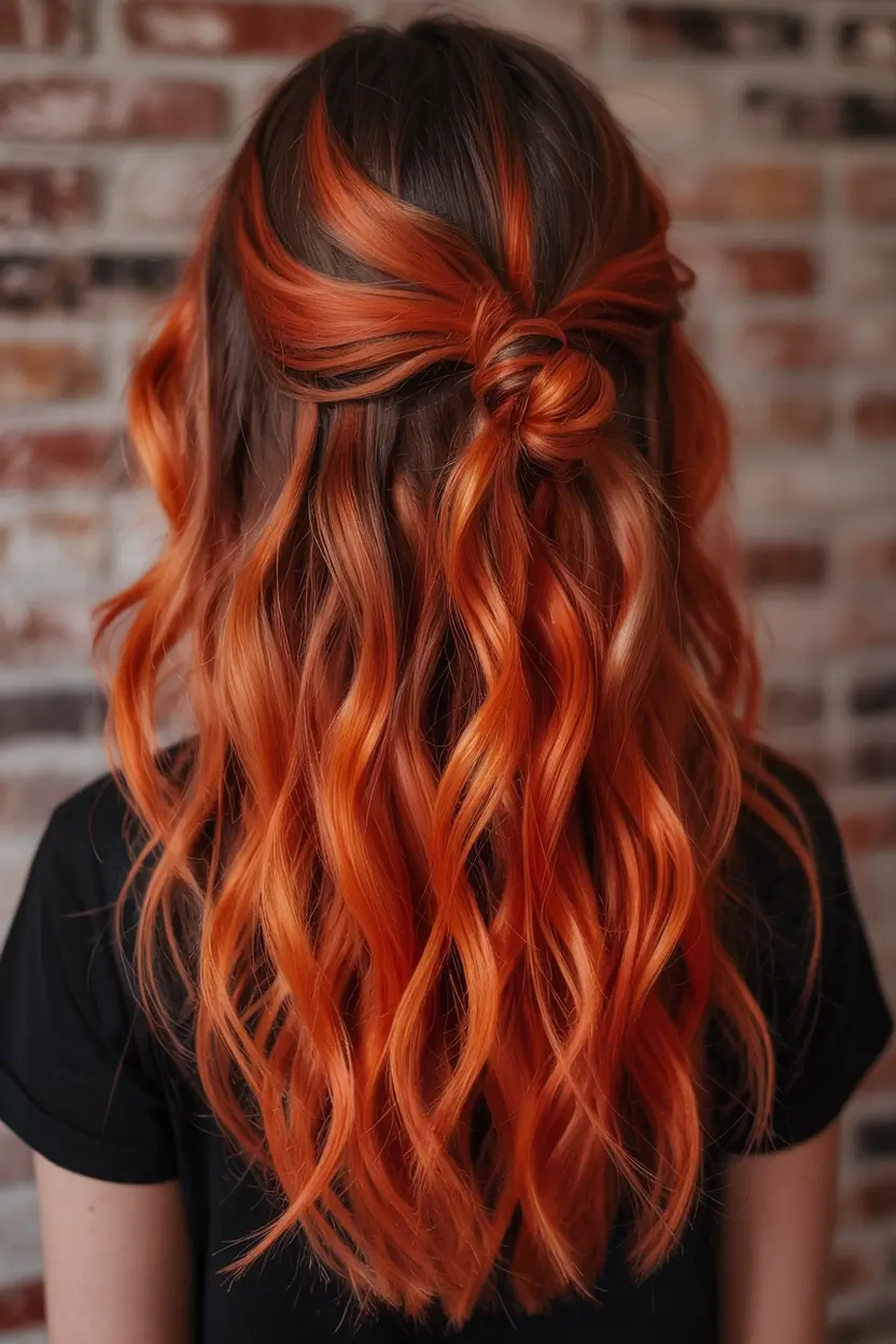 A beautiful brown foundation combines with radiant copper and red waves and forms a nostalgic half-up hairstyle. The combination of warm colors and smooth ringlets produces an attractive amount of volume together with a flow for medium hair lengths. People with short brown or dark skin colors can achieve this appealing gentle look. This style follows the natural fluidity color trends active in the current season.
