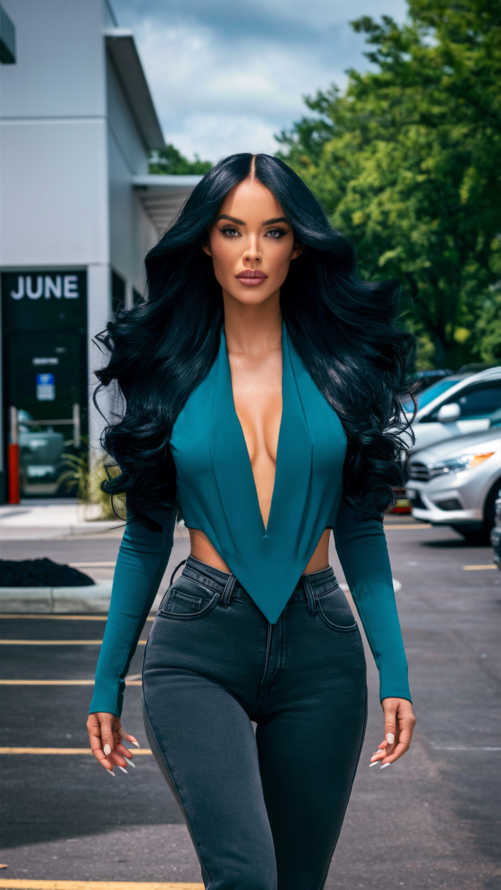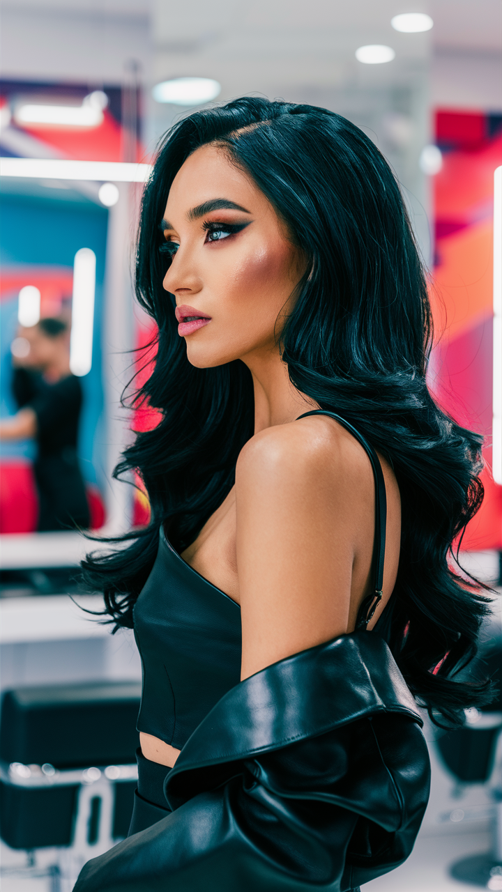 This natural hair color in deep black shines with a glossy finish and voluminous waves. The soft yet structured look complements wavy or straight hair patterns, offering a versatile and timeless style. Perfect for brunettes seeking a bold yet natural statement for any season.
