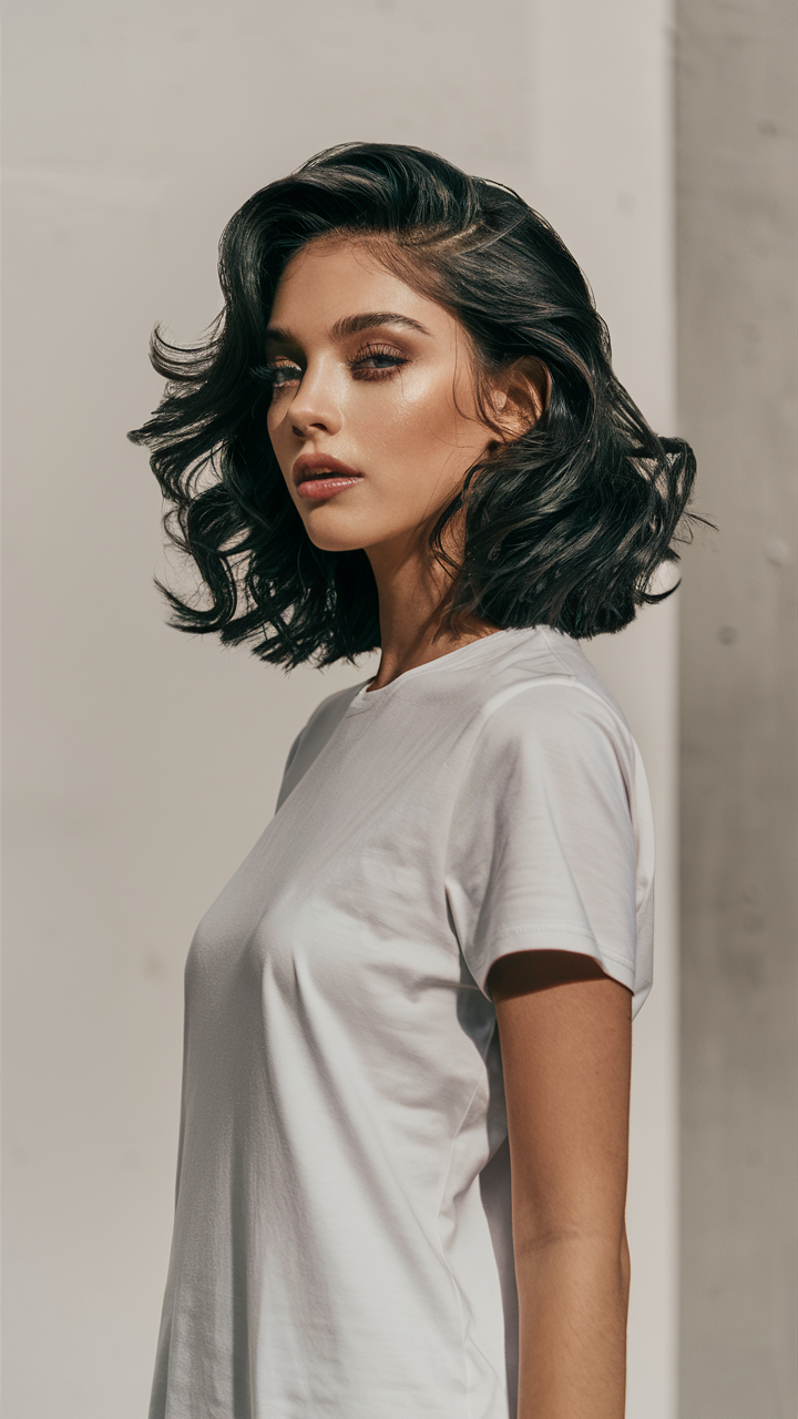 This textured lob in deep black natural hair color is styled with soft waves for a modern and effortless look. The slight tousle adds dimension, making it ideal for wavy hair patterns or layered cuts. Perfect for everyday wear, this hairstyle radiates confidence and versatility.