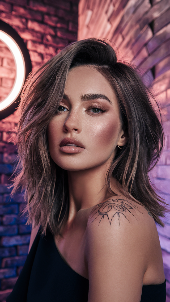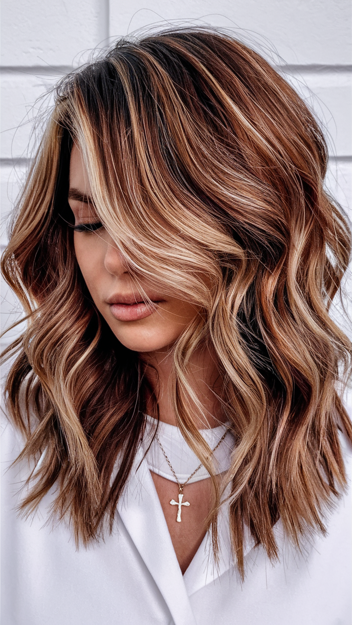 This shoulder-length cut is brought to life with a radiant sunlit balayage, blending honey and toffee tones seamlessly. The loose waves amplify the multidimensional highlights, offering natural hair color ideas for brunettes that balance brightness and warmth. Ideal for adding vibrance without dramatic color changes.