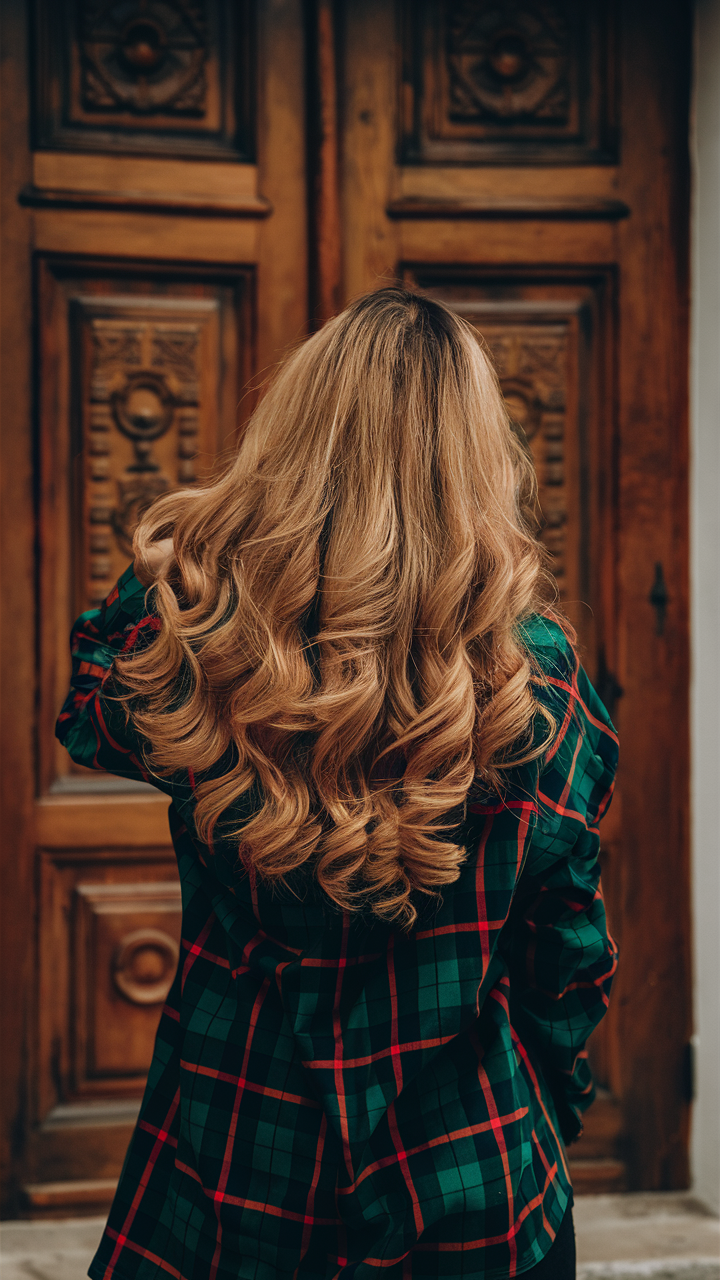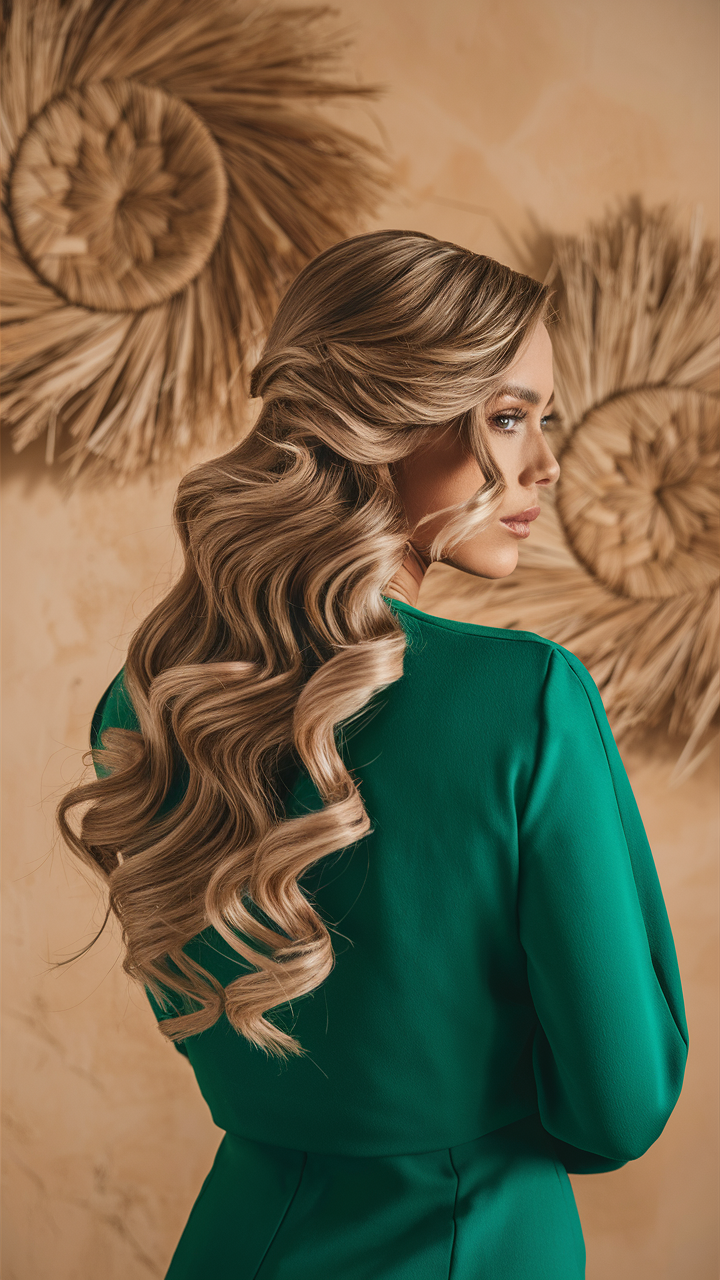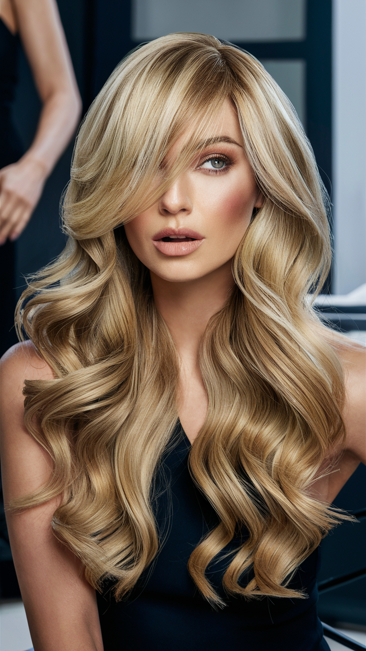 Soft golden blonde hair styled in loose waves gives this hairstyle a youthful and radiant appeal. The cut features long, feathered layers that add bounce and create an airy, effortless vibe. It’s a versatile style, ideal for both daytime events and evening occasions.