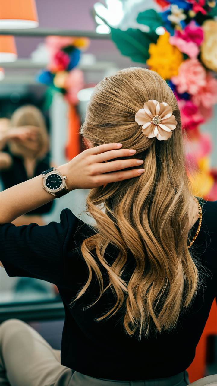 This natural hair color features soft golden blonde tones styled into loose, cascading waves. The half-up style is accentuated by a floral accessory, making it a versatile look for any season or occasion. Perfect for wavy hair patterns, this style offers a classic, elegant touch with minimal effort.
