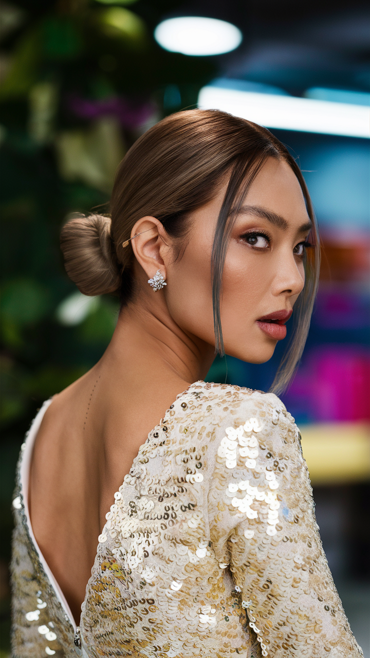 A sleek low bun highlights the soft ash-brown base with delicate natural hair color accents. This timeless hairstyle works well for straight or wavy hair patterns, offering a polished look for formal events. The subtle highlights provide a natural glow, enhancing the beauty of brunettes with understated charm.