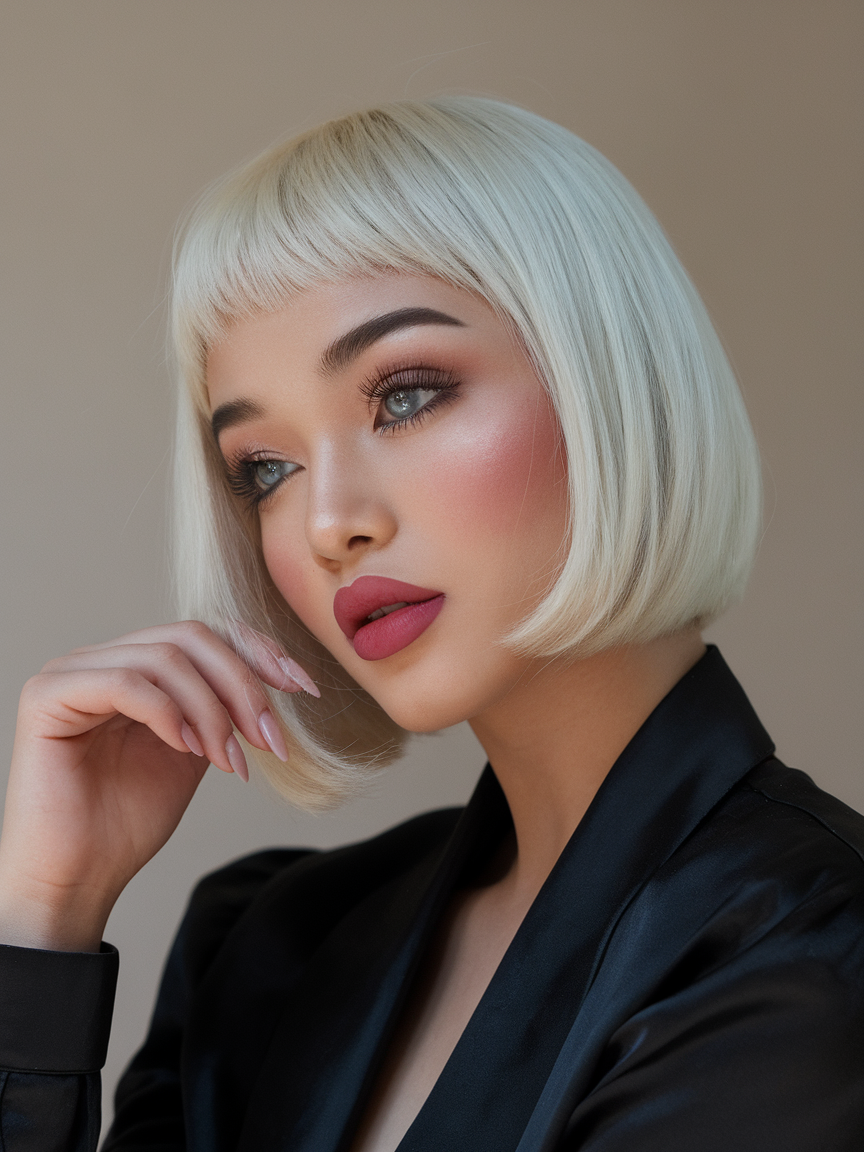 This frontal bob wig in straight hair platinum blonde features a sharp, structured cut with micro bangs. The sleek style frames the face beautifully, enhancing a unique and modern aesthetic. The lace frontal ensures a seamless, natural-looking hairline.