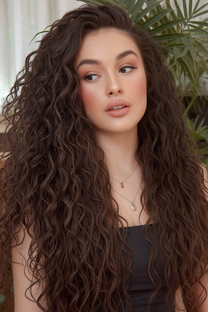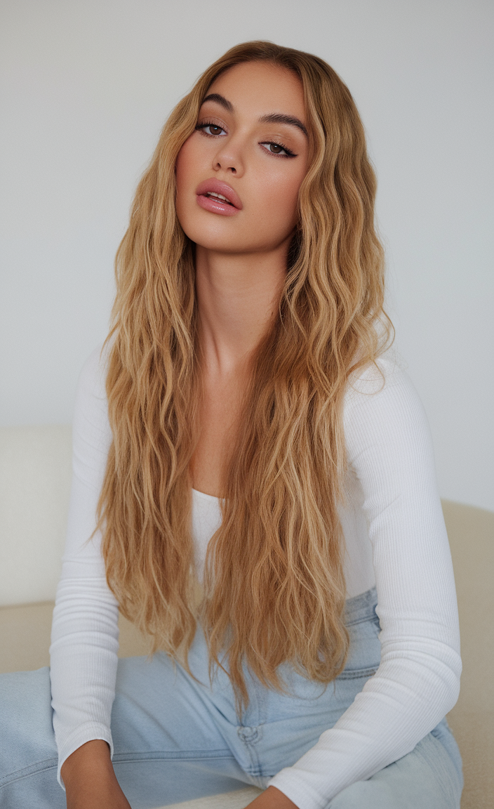This wet and wavy wig in a brown to honey blonde shade enhances natural texture with effortless waves. The long length and soft waves create a relaxed yet polished look, perfect for a breezy spring aesthetic. The dimensional color makes this style a unique and versatile choice.