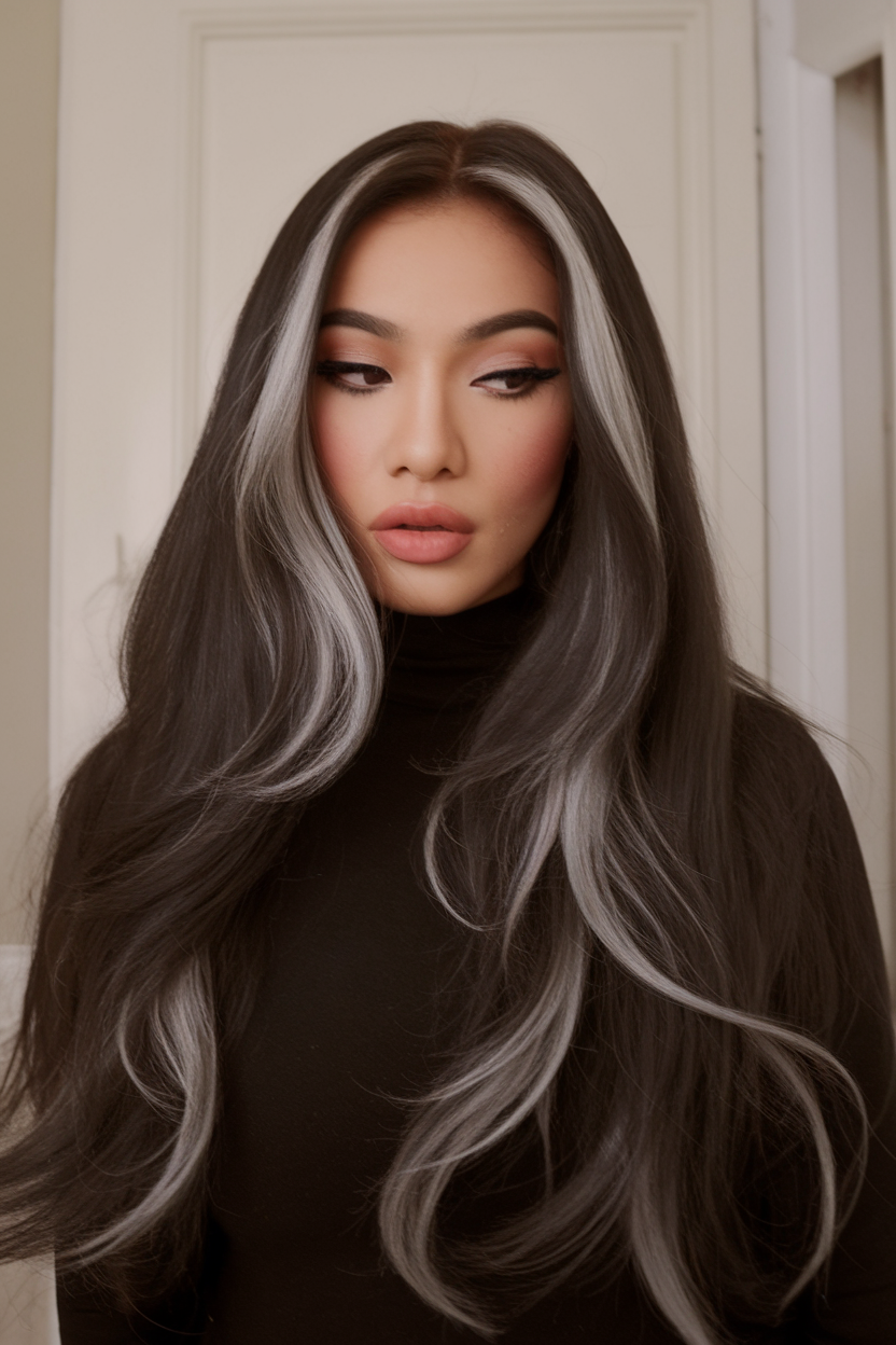 This lace front wig features a black base with striking silver face-framing highlights. The long, voluminous waves add dimension and movement, making it a unique and modern statement look. The contrasting tones enhance the style, perfect for a bold yet sophisticated aesthetic.