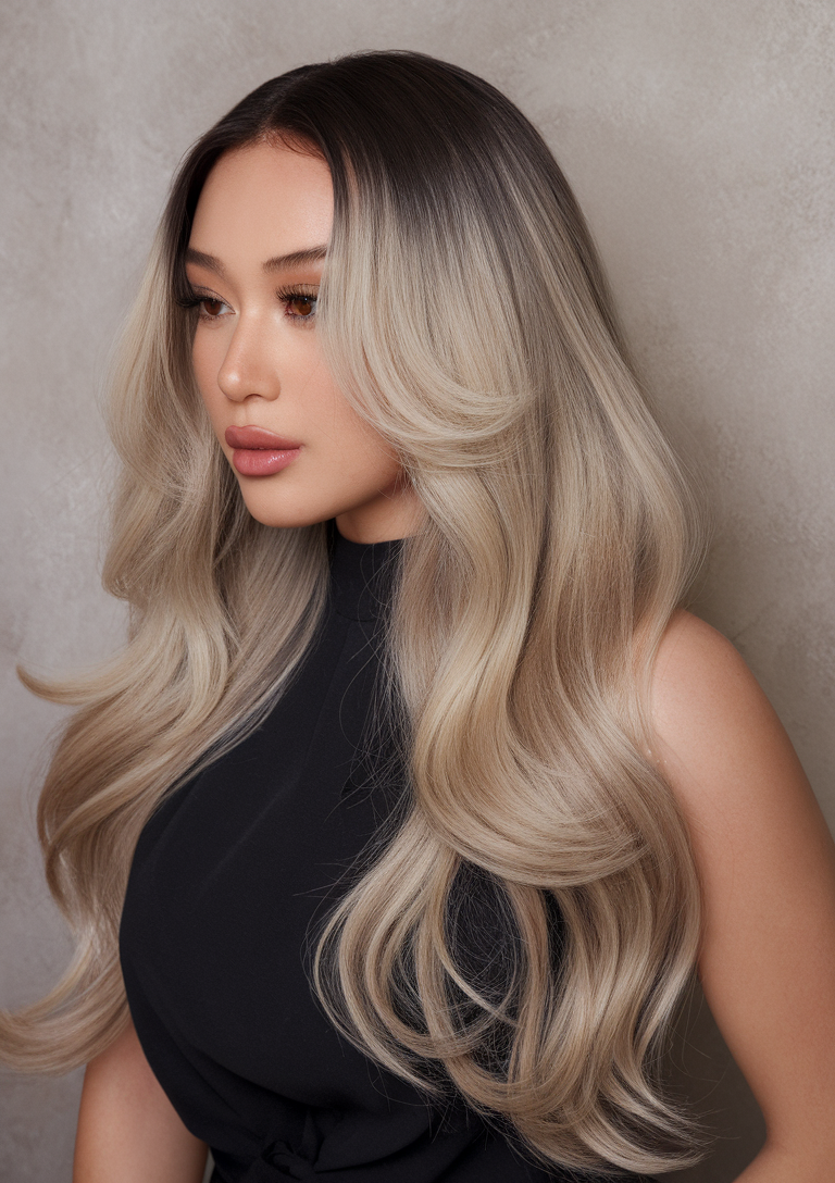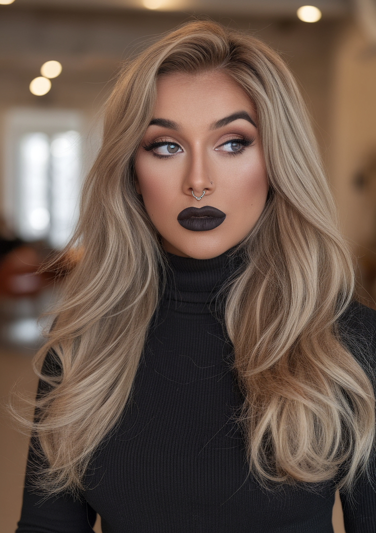 This lace front wig features an elegant brown to ash blonde ombre with soft body wave curls. The voluminous layers enhance the depth and dimension, creating a luxurious and polished finish. This unique style is perfect for adding sophistication to a spring wigs hairstyle 2025 update.
