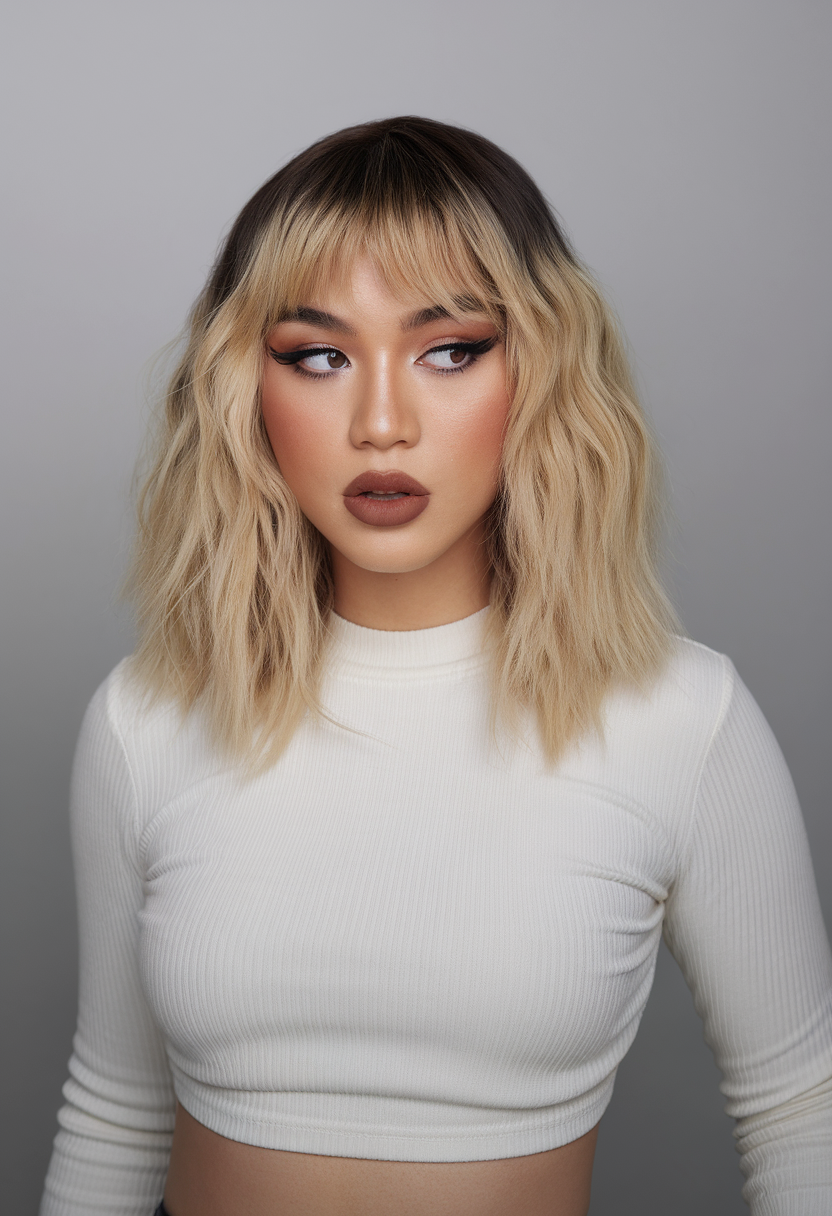 This frontal bob wig is a chic blend of short layered waves and soft bangs. The light blonde shade adds a fresh and airy feel, perfect for a spring wigs hairstyle 2025 update. The gentle inward curl at the ends enhances the volume, creating a cute and effortless look.