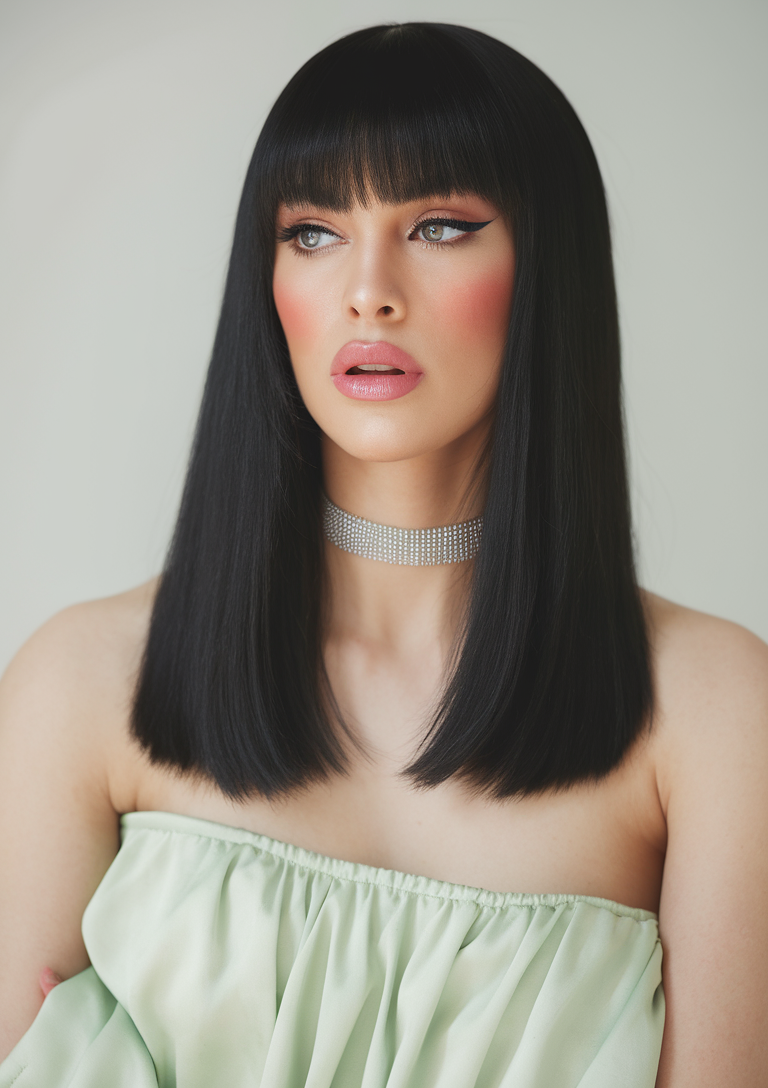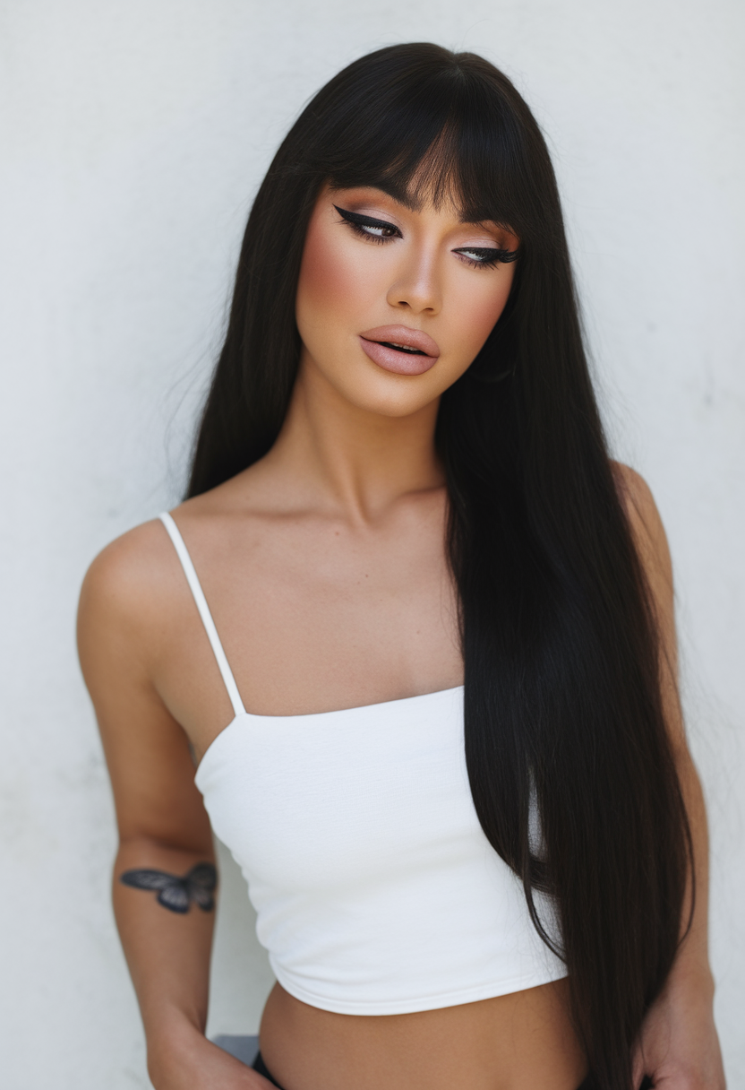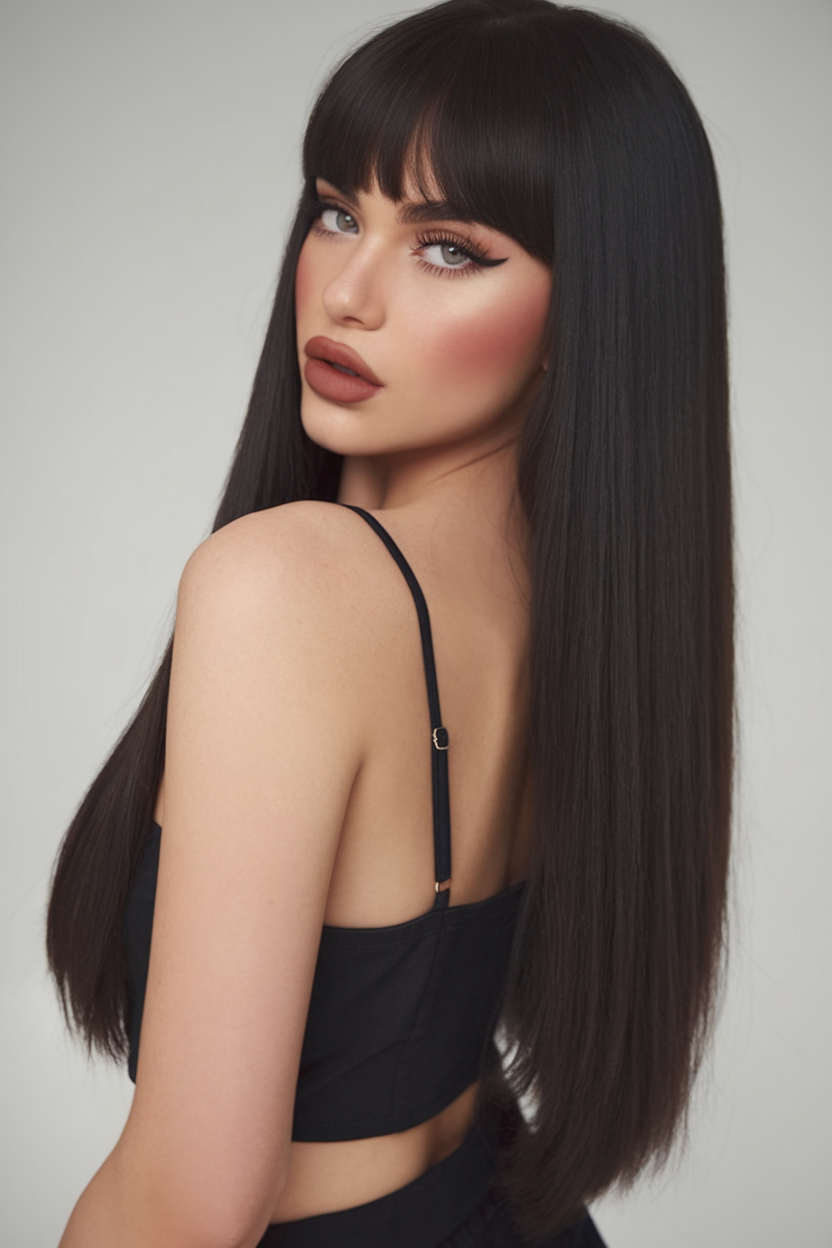 A jet black wig with blunt bangs offers a sleek and timeless look with a bold, modern edge. The straight hair enhances the sharp cut, creating a polished and sophisticated style. Perfect for a chic, statement appearance that suits any occasion.