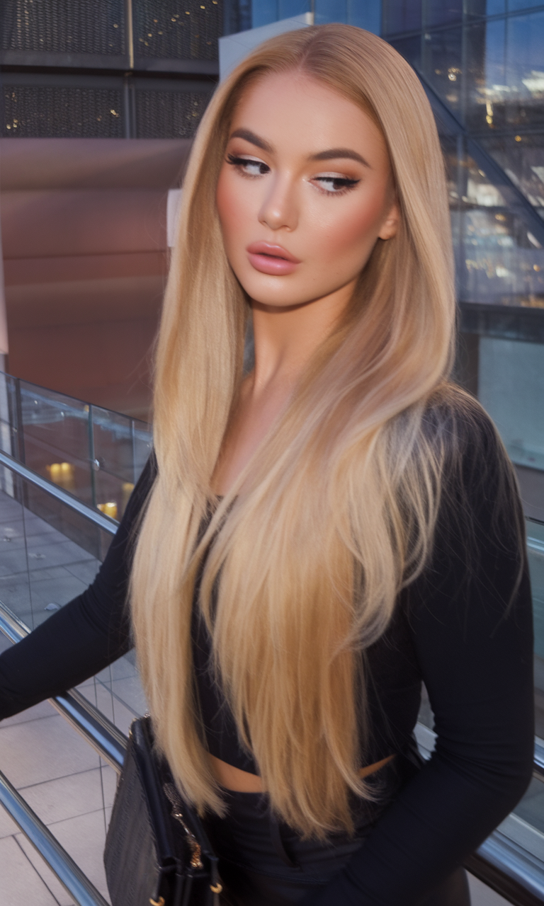 This lace front wig features a rich golden blonde hue with sleek, straight hair that falls gracefully down the back. The smooth texture and polished shine make this style timeless and elegant. The long layers enhance movement, creating a luxurious and natural look.