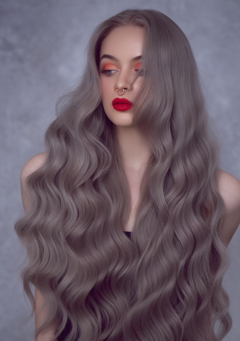 This deep wave frontal wig showcases a striking silver-gray tone with long, flowing waves. The voluminous curls add texture and bounce, making this a unique and eye-catching style. Perfect for those looking for a bold yet sophisticated spring wigs hairstyle 2025 update.