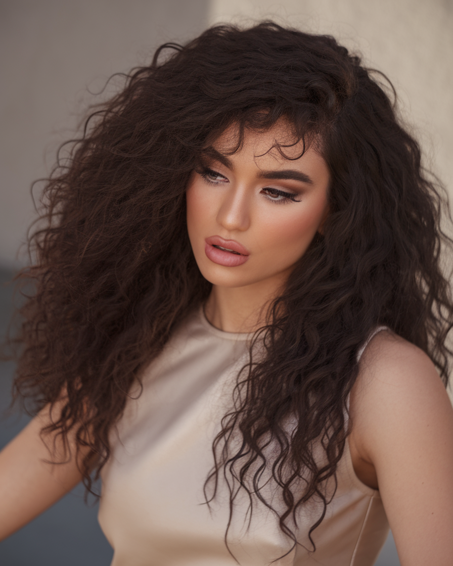This kinky curly lace frontal wig in a deep, rich black shade is full of volume and definition. The structured curls create a natural, voluminous look, ideal for those who love texture. The deep curly pattern enhances the fullness, making it a bold and elegant choice.