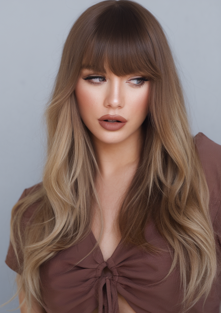 This brown wig transitions into a soft ombre with body wave texture, adding dimension and movement. The long layers flow naturally, complemented by full, rounded bangs that frame the face beautifully. This is a timeless style, making it a great option for an everyday lace front wig.
